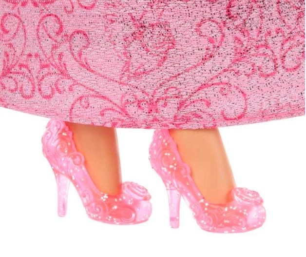 Куклата е облечена в розова рокля с блестящи детайли и украси, които пресъздават филмовия облик на Аврора.