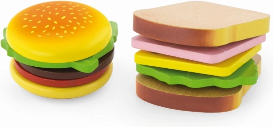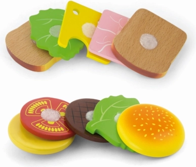Този дървен комплект VIGA за хамбургер и сандвич е идеален за малки деца, които обичат да имитират възрастните по време на готвене. Цветните и безопасни дървени компоненти, като питки, салата, домати и сирене, позволяват неограничена игра и креативност. Играчката помага в развитието на: