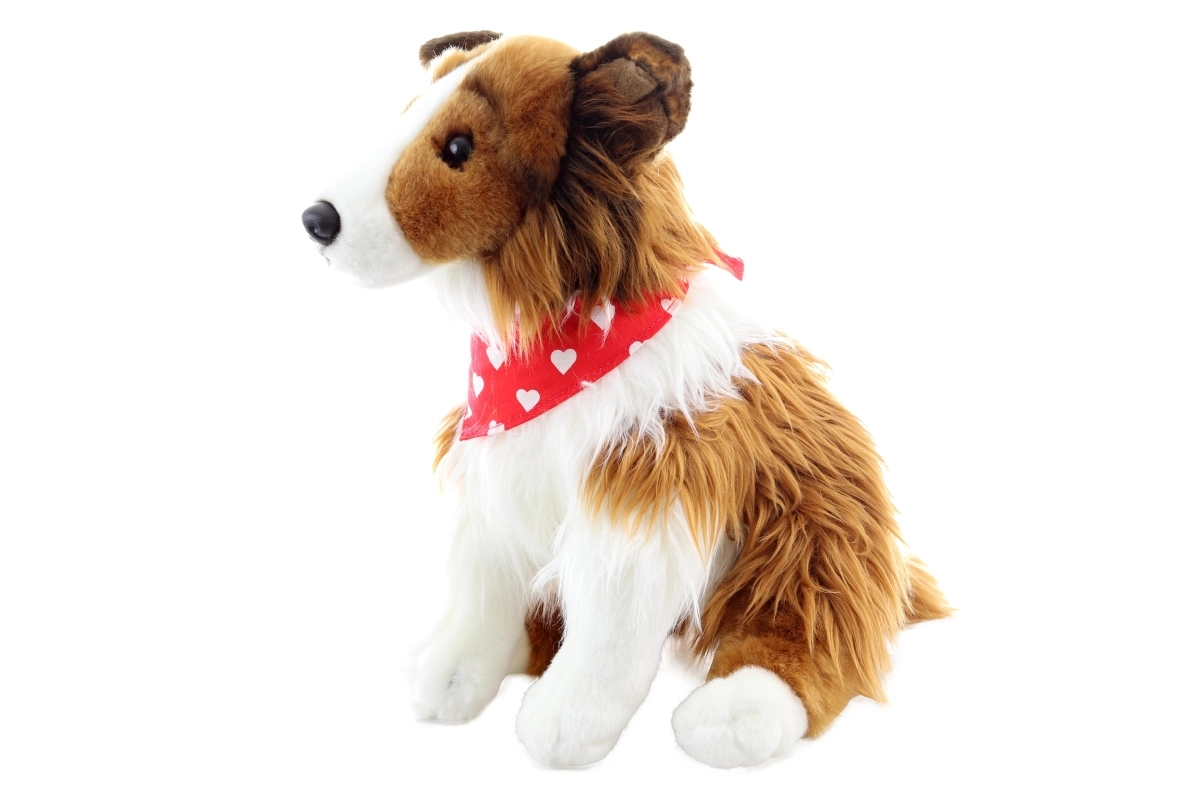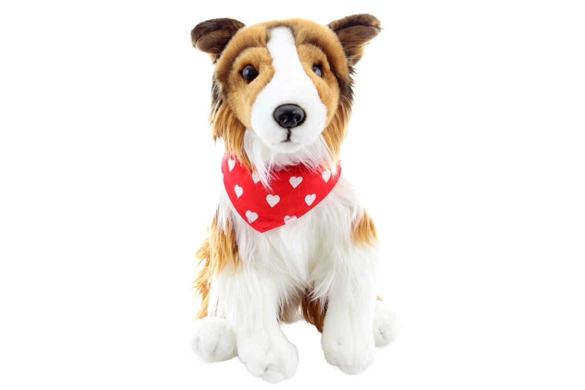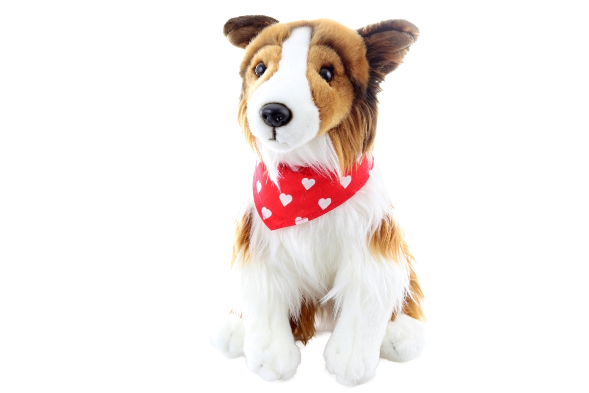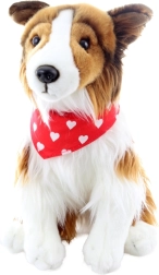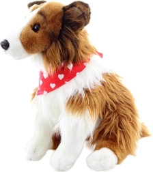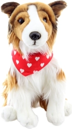 Тази плюшена играчка във форма на куче дългокосместа коли е покрита с меко кафяво-бяло пухче и е идеална за деца от 0 години. Оборудвана е с червен шал с бели сърчица, което добавя към очарованието й.