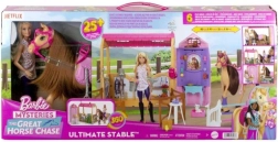Открийте магията на ездаческия свят с плейсета Barbie Ultimate Stable, вдъхновен от сериала Barbie Mysteries: The Great Horse Chase. Над 25 части и 6 игрови зони носят безкрайна креативна игра – от хранене и грижа за конете, през тренировки за прескачане на препятствия, до излагане на трофеи. Кончето има дълга грива и опашка за разресване и стилизиране, куклата сгъва колене за реалистична езда, а конюшнята може лесно да се сгъва за съхранение.