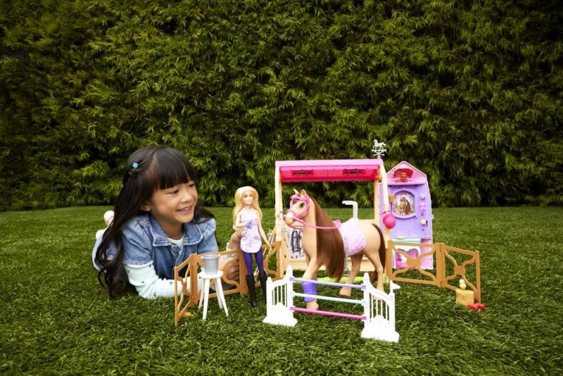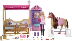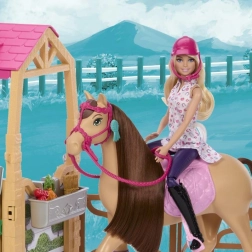 В комплекта има кукла Барби в ездаческо облекло, кон с реалистични детайли и дълга мека грива, конюшня с навес и богата селекция аксесоари за въображаема игра. Идеален е за деца на 3+ години, които обичат коне, грижа за животни и измисляне на собствени истории.