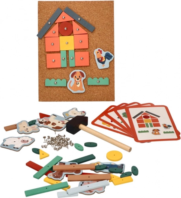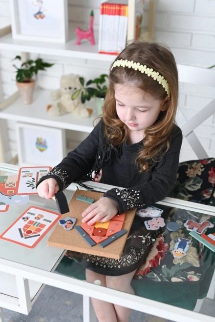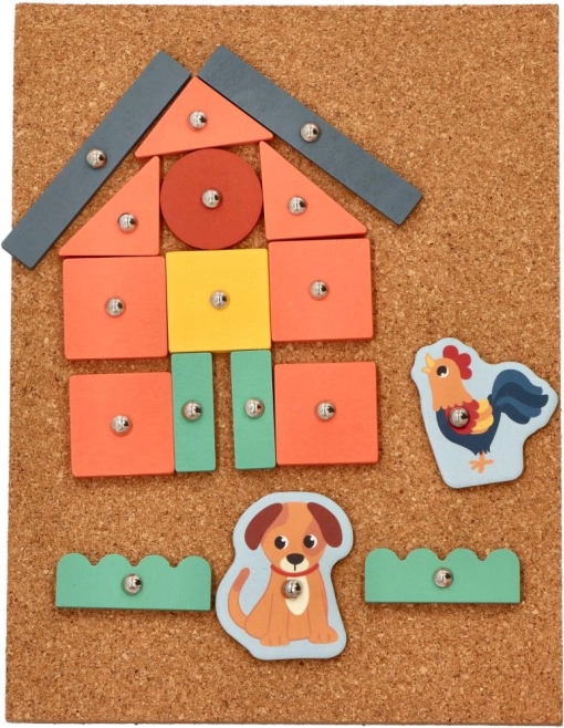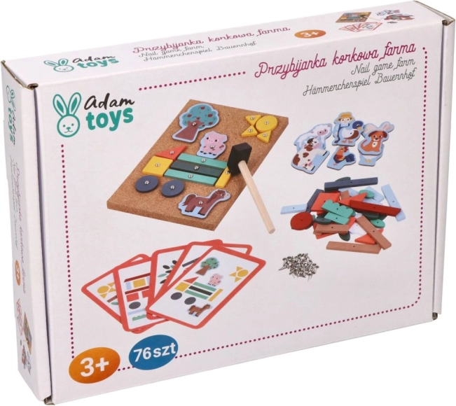 Корковата набиванка - Приключения във фермата е идеален начин да насърчите децата да създават свои собствени истории. Този комплект предлага множество цветни дървени форми и фигурки от фермата, които могат да се прикрепят към корковата дъска с помощта на малки пирончета и чукче. Децата могат с помощта на инструкционни карти да изграждат различни сцени и така да развиват своите пространствени умения.