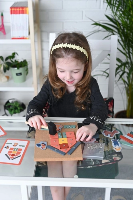 Играчките са идеални за креативна и образователна игра, която насърчава децата да проектират и прикрепят форми върху корковата дъска.