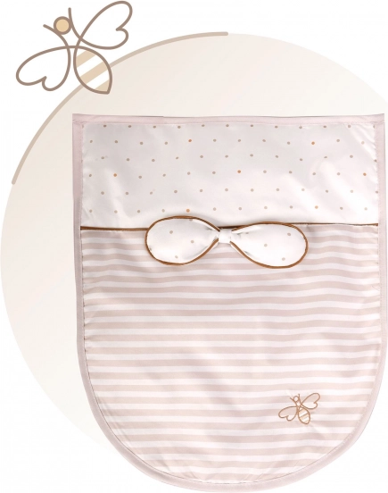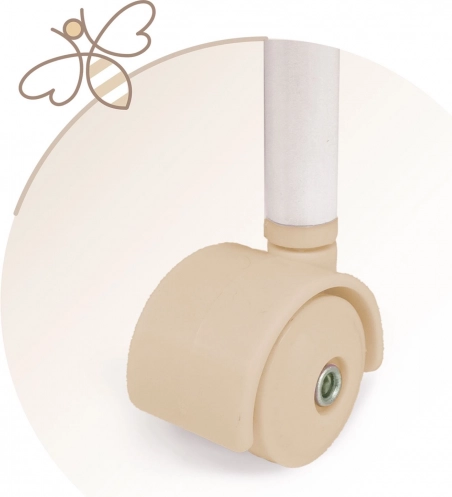Това стилно легълце за кукли е в меки пастелни тонове бежово и бяло с деликатни точки и райета. Естествената визия е допълнена от панделки, напомнящи венчелистчета, и малки бродерии на пчелички, които подчертават чара на цялата колекция VERONA. Благодарение на въртящите се колелца легълцето лесно се премества от стая в стая, за да може малката грижеща се майка винаги да има своето бебе до себе си.