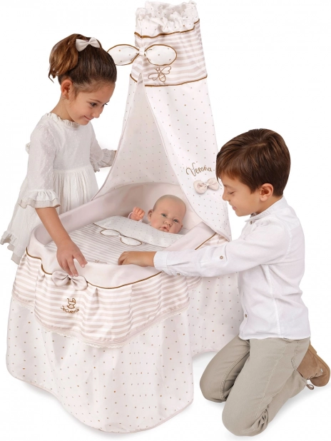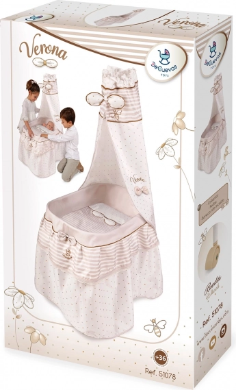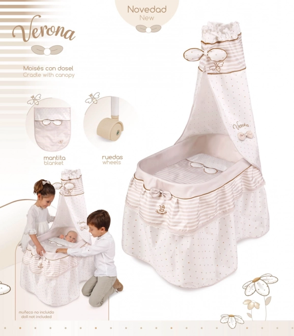 Елегантно подвижно легълце за кукли от колекция VERONA с нежен естествен дизайн, балдахин с панделки, удобна завивка и 4 въртящи се колелца за лесно маневриране. Прецизна изработка, лека манипулация и безопасни материали, които ще зарадват всяка малка майка.