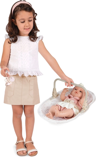 Това многофункционално столче и люлка за кукли 3 в 1 от колекция Verona носи на децата реалистична игра и много възможности за грижа за любимото им бебе. Съчетава светлобежово и бяло с точки и райета, допълнени с фин кант и апликации с панделки, за да създаде непреходна естествена визия, вдъхновена от испанския дизайн.