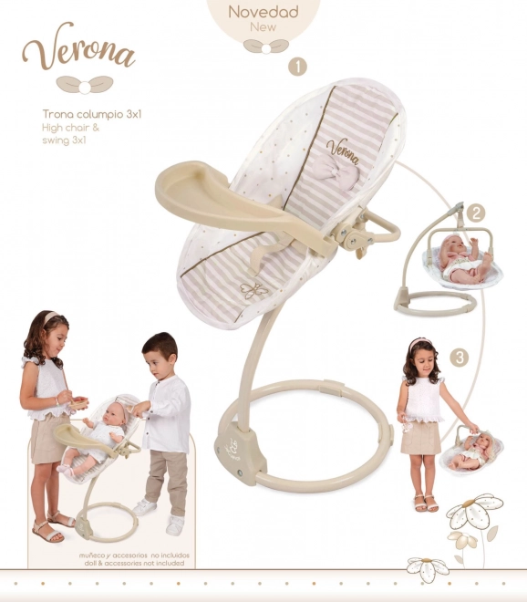 Елегантният и практичен комплект 3 в 1 за кукли от колекция Verona съчетава столче за хранене, люлка и носилка в едно. Благодарение на сваляемата двулицева седалка с предпазни колани и пластмасовата табличка играта е лесна и безопасна. Модерният дизайн в нежни естествени цветове, качествената изработка и лесната маневреност ще зарадват всяко дете от 3 години нагоре.