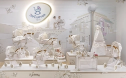 Нежна комбинация от бежово и бяло с точки и райета, декоративни панделки и бродерии придават на количката очарователен вид, който децата обичат.