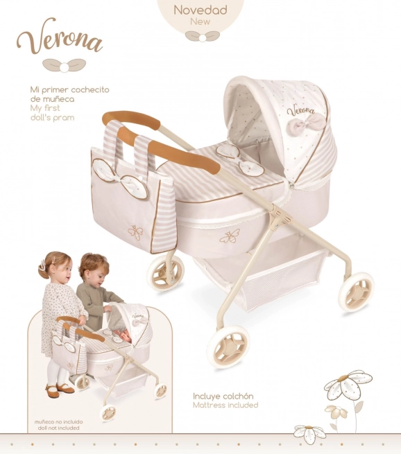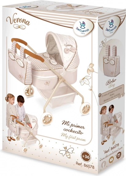 Елегантна количка за кукли в естествени пастелни цветове, която предлага лека и стабилна ходова част, лесно управление и богат набор от аксесоари, включително подвижна чанта, матрак и долна кошница. Идеална за деца от 3 години, които обичат реалистична игра на мама.