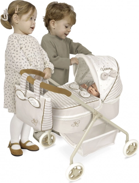 Открийте очарователната количка за кукли в нежна комбинация от бежово и бяло с точки и райета. Качествената изработка и испанският дизайн осигуряват дълъг живот, докато ниската дръжка и ниското тегло улесняват управлението дори от най-малките деца. Стилът е допълнен от декоративни панделки и нежни бродерии.
