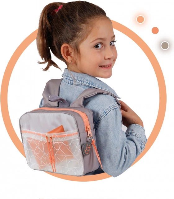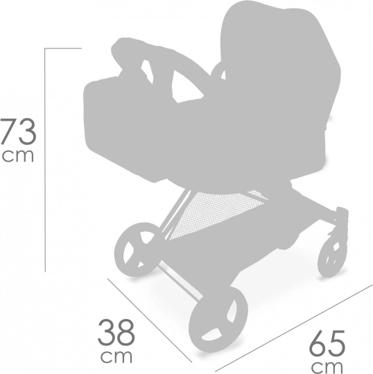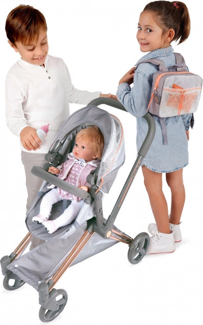 Практичната складлива конструкция спестява място у дома и в колата. Въртящите се предни колела улесняват маневрирането, триточковият колан държи куклата безопасно, а долният кош осигурява допълнително място за съхранение. В комплекта има модерна раничка с прозрачен джоб за дребни вещи и покривало за кошчето с цип.