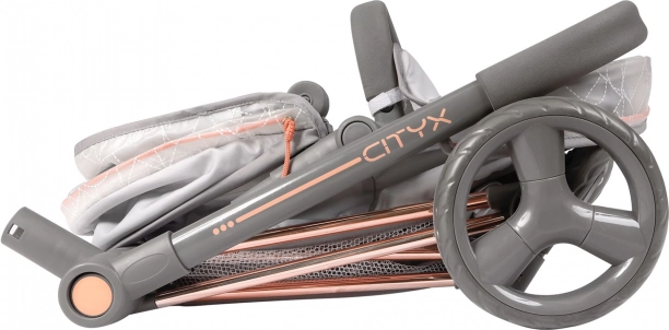 Стилна количка за кукли 3 в 1 от колекция CITY X впечатлява с модерен сиво‑меден дизайн, подвижно кошче, регулиращ се сенник и въртящи се предни колела за лесно управление. Предлага складлива конструкция, триточков колан, практичен долен кош и раничка с прозрачeн джоб – идеална за деца от 3 години.