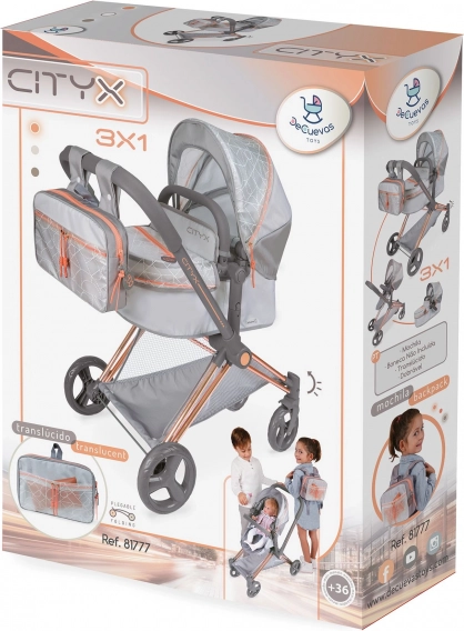 Игрален модел количка за кукли 3 в 1 от колекция CITY X, която вярно наподобява модерните детски колички. Съчетава качествени текстили с прозрачно PVC с ефект „стъкло“ и елегантни медни акценти. Благодарение на подвижното кошче, което може да се постави по или против посоката на движение, и възможността за преобразуване в спортна седалка, децата ще се радват на реалистична и удобна игра.