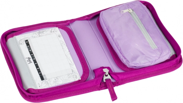 Предната страна е украсена с детайлен мотив на еднорог в розово-лилави тонове, който превръща несесера в забележим аксесоар за училище.