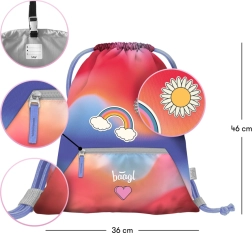 В долната част има практичен джоб с цип, в който можете да съхранявате дребни предмети, ключове или кърпички. Здравите връзки служат за лесно стягане и позволяват удобно носене на гръб като раница. В комплекта е включена и карабинка за бързо закачане към ученическа чанта или училищна раница.