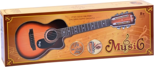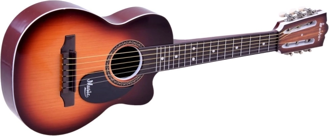 Тази детска китара комбинира атрактивния вид на дърво с издръжлива пластмасова конструкция, затова е лека, удобна за държане и безопасна за ежедневно свирене. Със шест метални струни предлага реалистичен звук и помага на децата да развиват ритъм и усет за тон.