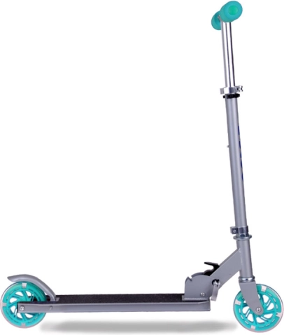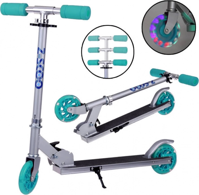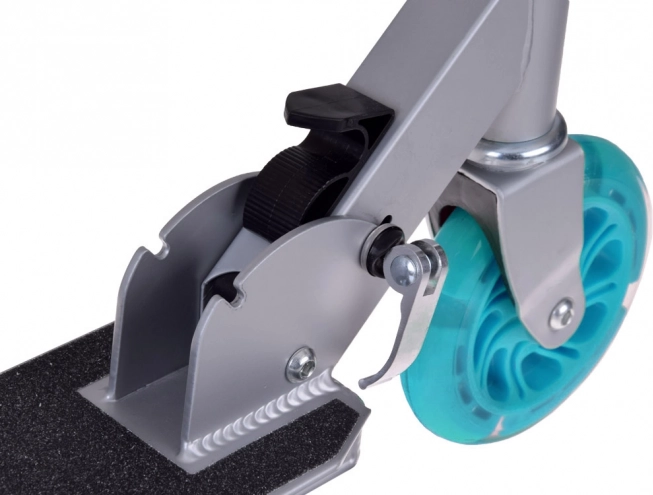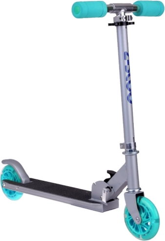 Тази сгъваема детска тротинетка комбинира ниско тегло, здрава метална конструкция и закачлив дизайн с тюркоазени акценти. Благодарение на LED колелата, които светят при движение и не изискват батерии, детето е по-видимо, а всяко каране е по-забавно.