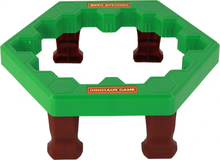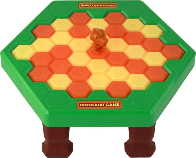 Шестоъгълната игрова дъска с цветни елементи и фигурка на динозавър в центъра задържа вниманието на деца и възрастни. Всеки ход решава дали динозавърът ще бъде спасен.