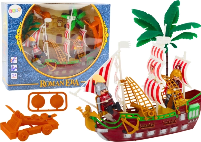 Благодарение на вградените колелца корабът се движи гладко по пода и масата, а катапултът, палмите и фигурките на римски войници позволяват създаването на динамични битки и исторически сцени.