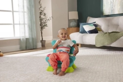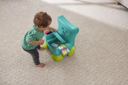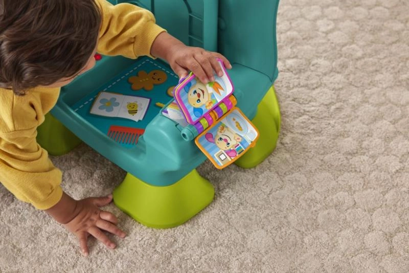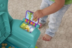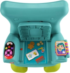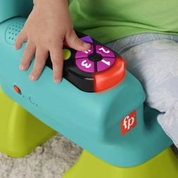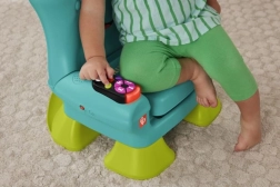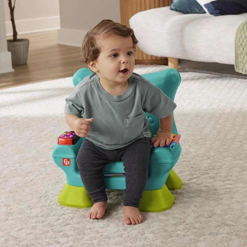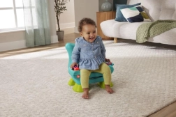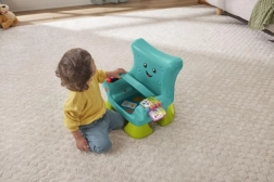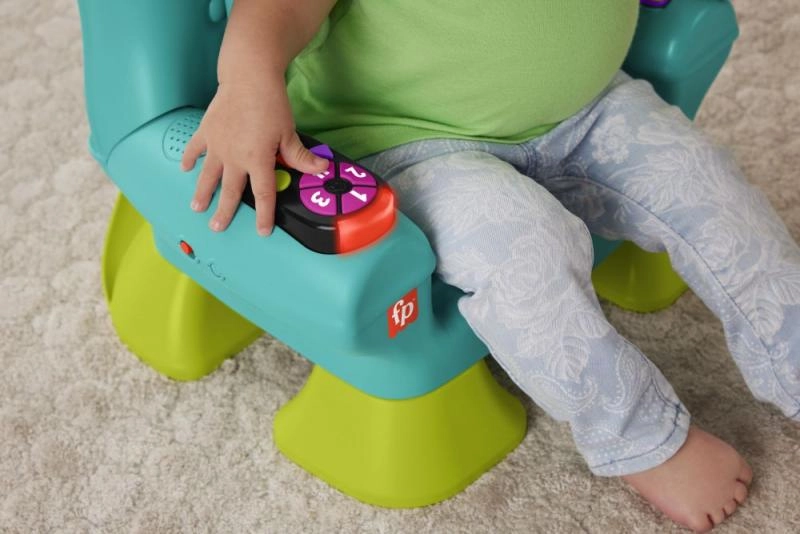 Столчето разпознава кога детето сяда или става и го възнаграждава с музика и фрази. Бутоните с числа и форми, светещото дистанционно и книжката развиват моториката и любопитството.