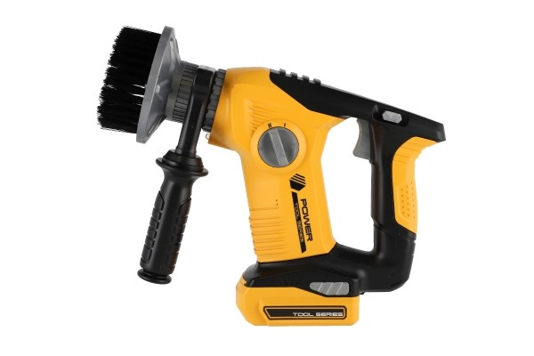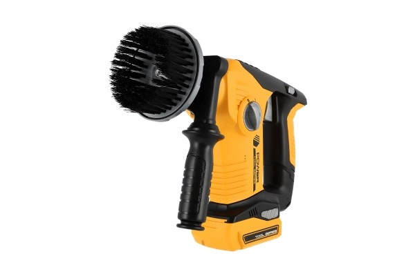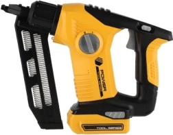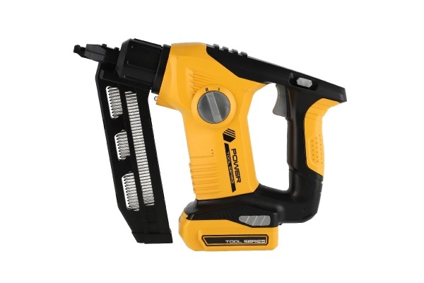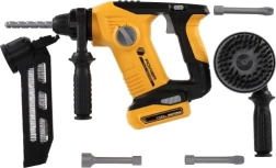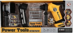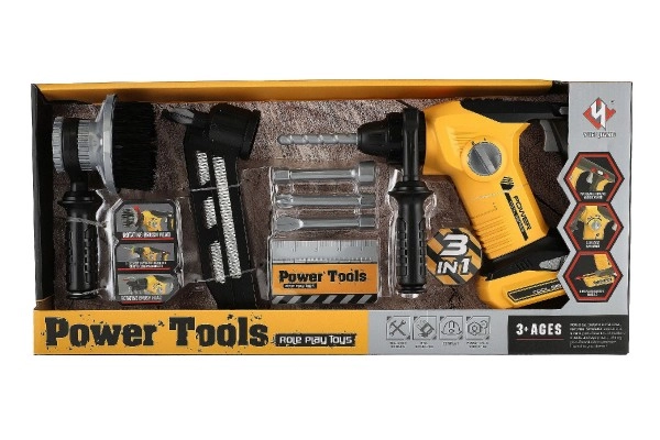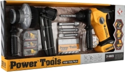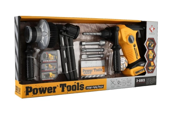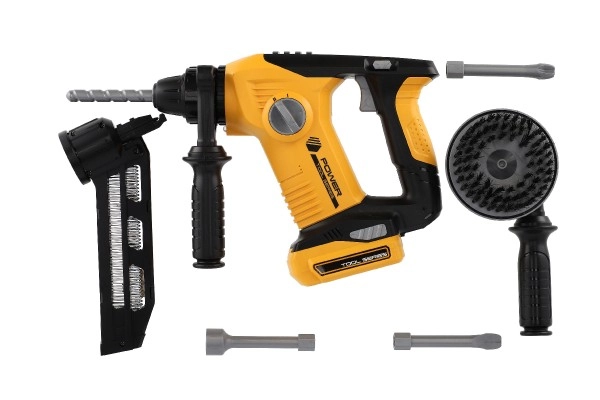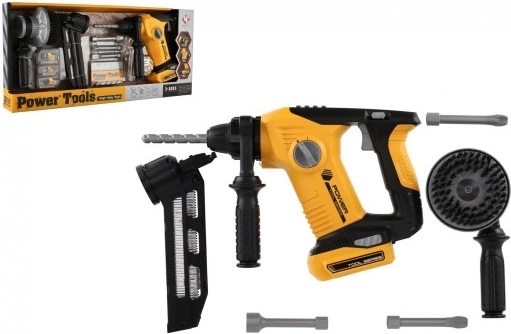 Комплектът включва различни накрайници и инструменти, които имитират реални строителни дейности.