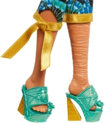Куклата Cleo De Nile се готви за най-горещото музикално събитие на годината – Monster Fest! Откроява се с топ със златни ръкави, панталон в цветове на скъпоценни камъни и корона с мотив лотос, която подчертава дългата й синя коса. Благодарение на ставите лесно ще нагласите готини пози за снимки и разиграване на истории.