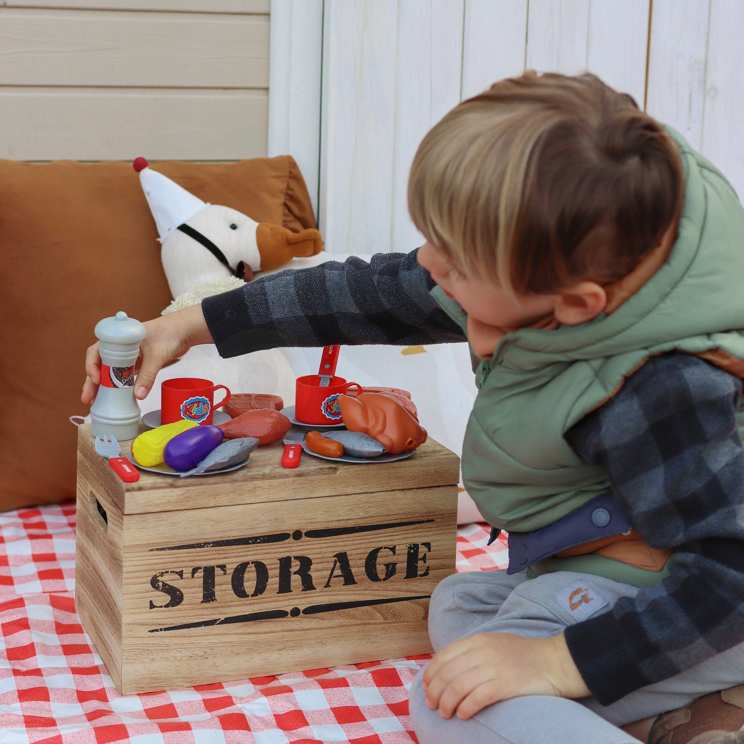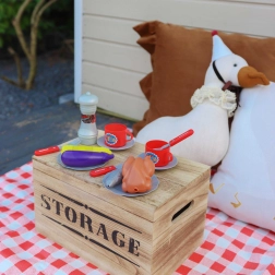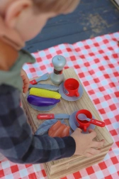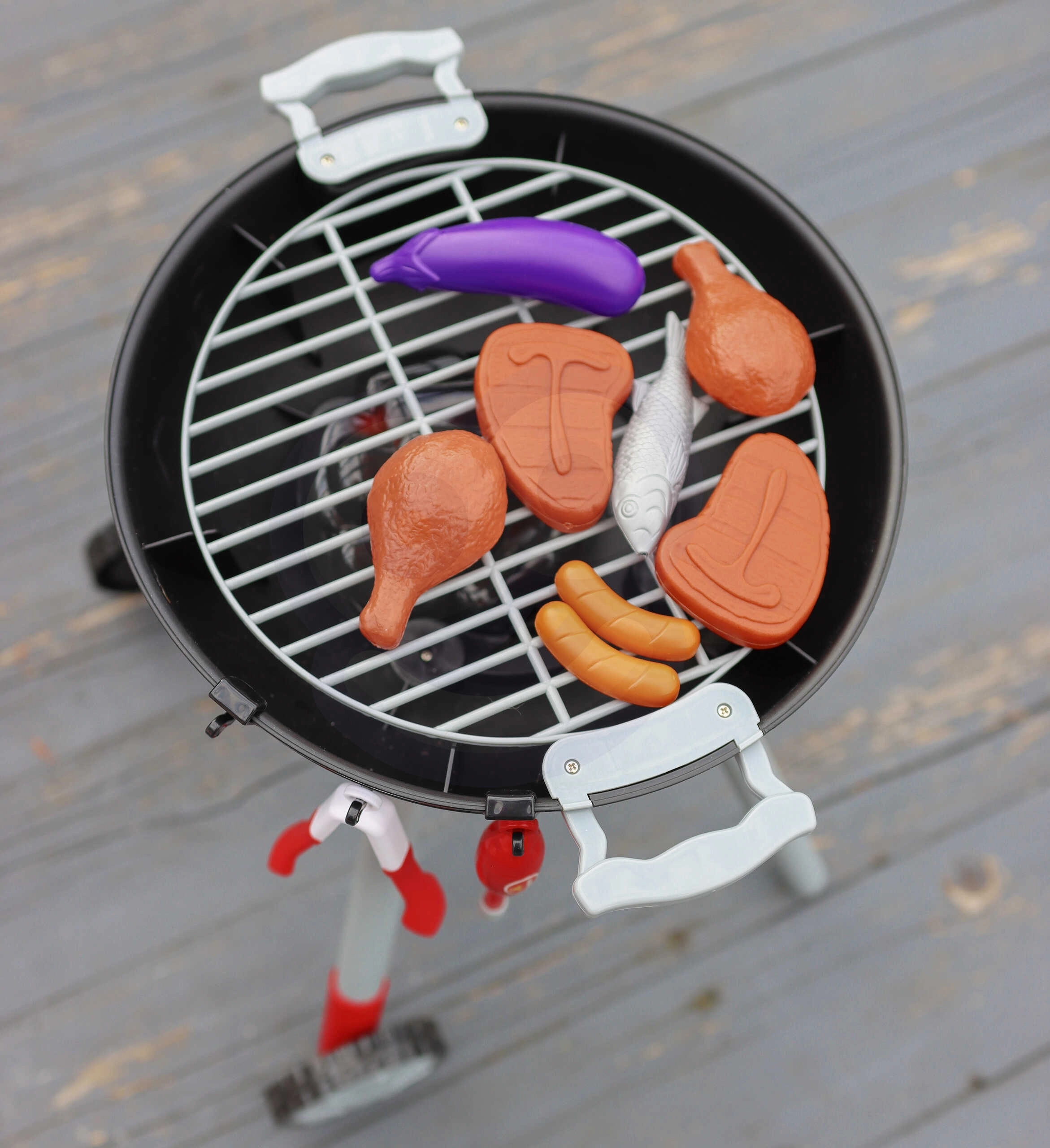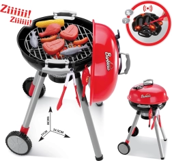 Комплектът съдържа всичко необходимо за имитация на семейно BBQ: прорези на скарата, богат избор от пластмасови храни (наденички, стекове, пиле, риба, царевица, патладжан), принадлежности, чинийки, чашки и дори мелничка за пипер. Свалящият се капак предпазва скарата след „гриловане“, а благодарение на колелцата и дръжката децата лесно преместват грила на терасата или в детската стая.