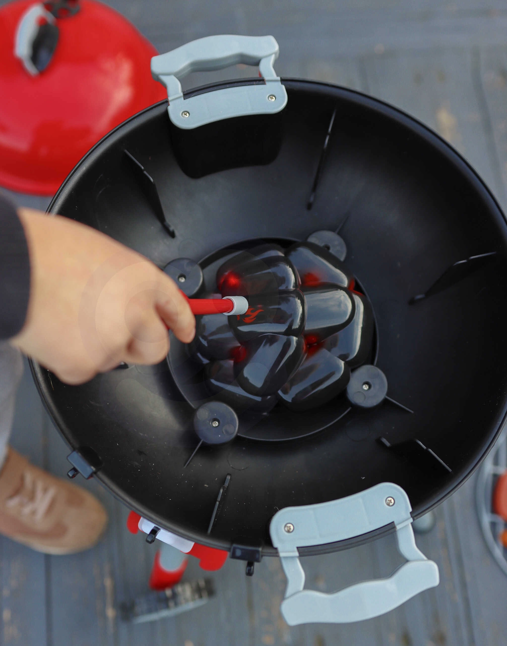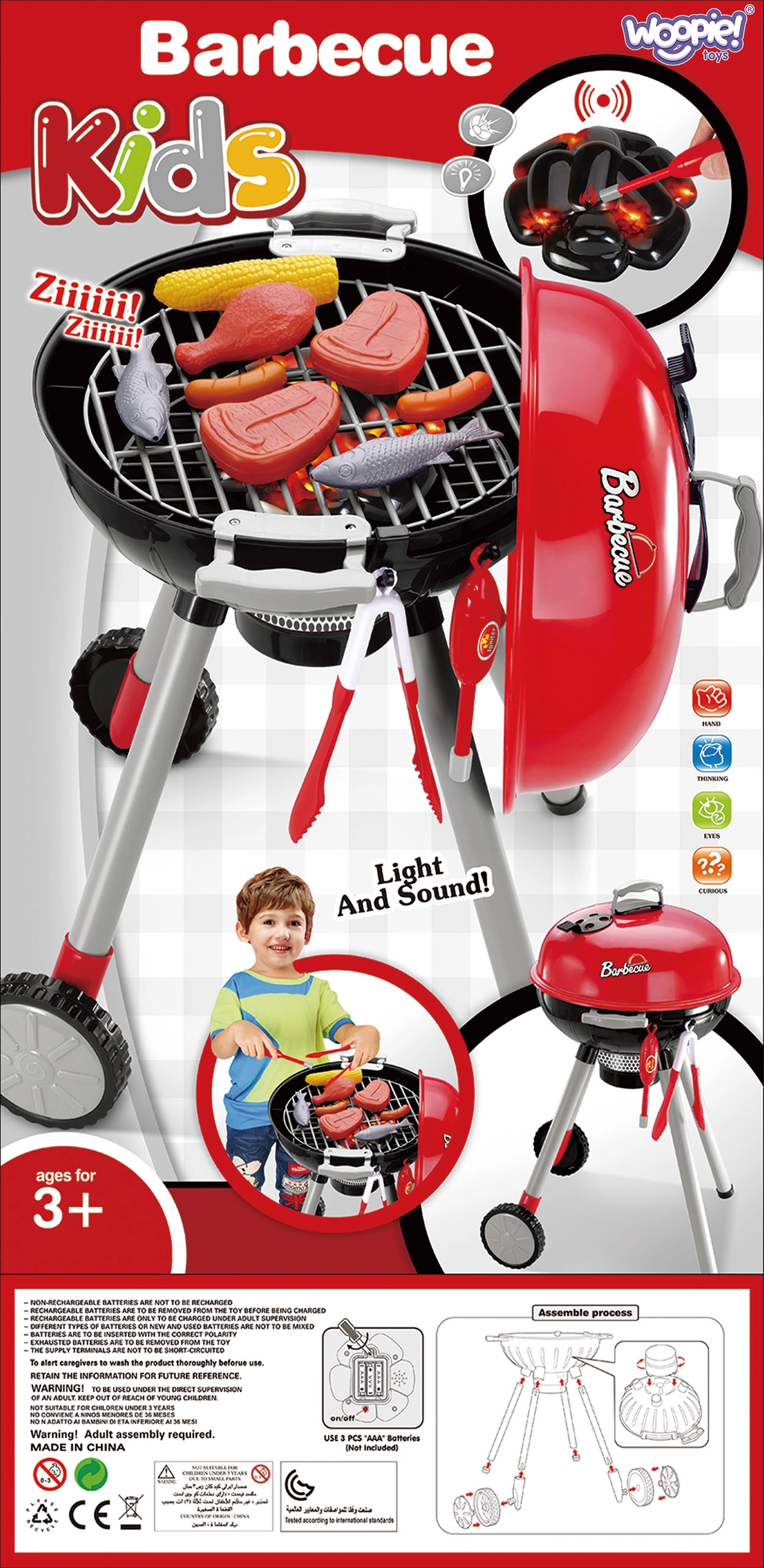Детското барбекю WOOPIE изглежда и функционира като истинско. Достатъчно е да доближите запалката до въглените и се активират реалистични светлинни и звукови ефекти, имитиращи разпалване. Червено жарящите въглени и характерният звук ще впечатлят всички малки фенове на готвенето.