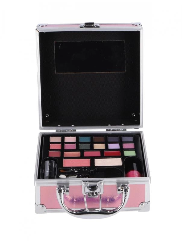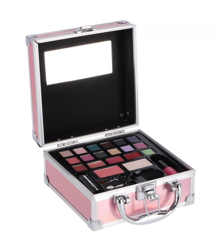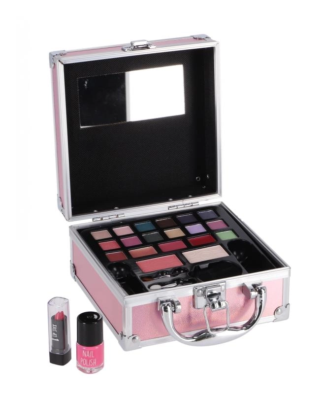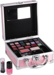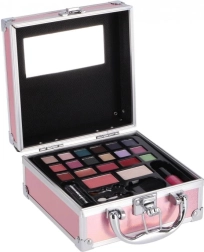 Стилен розов мини куфар за грим за ежедневна употреба и пътуване. Съдържа всичко необходимо за бърз грим: 14 сенки за очи, блестящи цветове за устни, румени и пудра, червило и лак за нокти. Практично огледалце, четка за руж, апликатор с гъбичка и четка за устни осигуряват удобна апликация у дома и в движение.