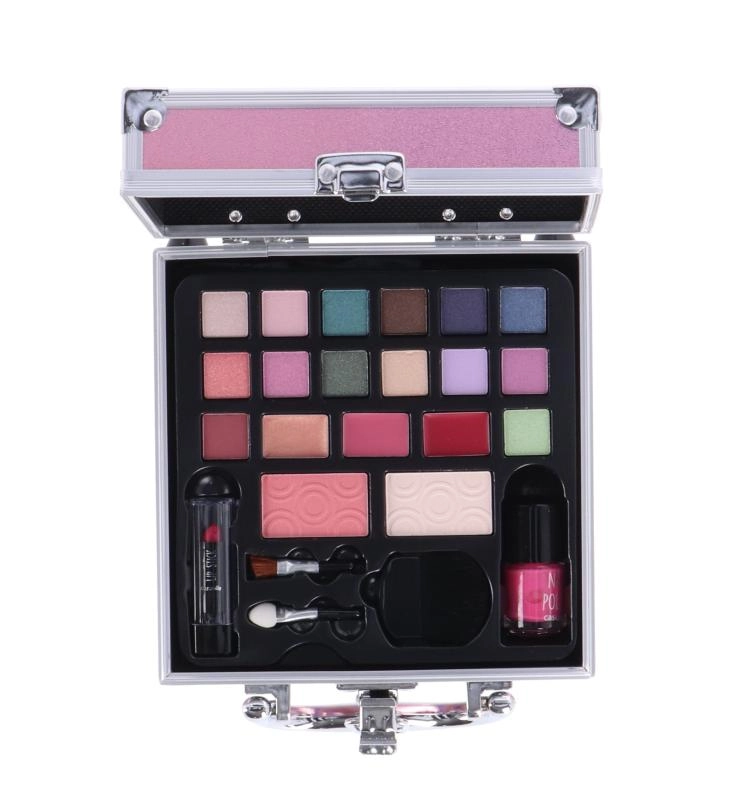 - 14× сенки за очи, 3× блестящи цветове за устни, 1× руж, 1× пудра, 1× червило, 1× лак за нокти, 1× четка за руж, 1× апликатор с гъбичка, 1× четка за устни, 1× огледалце