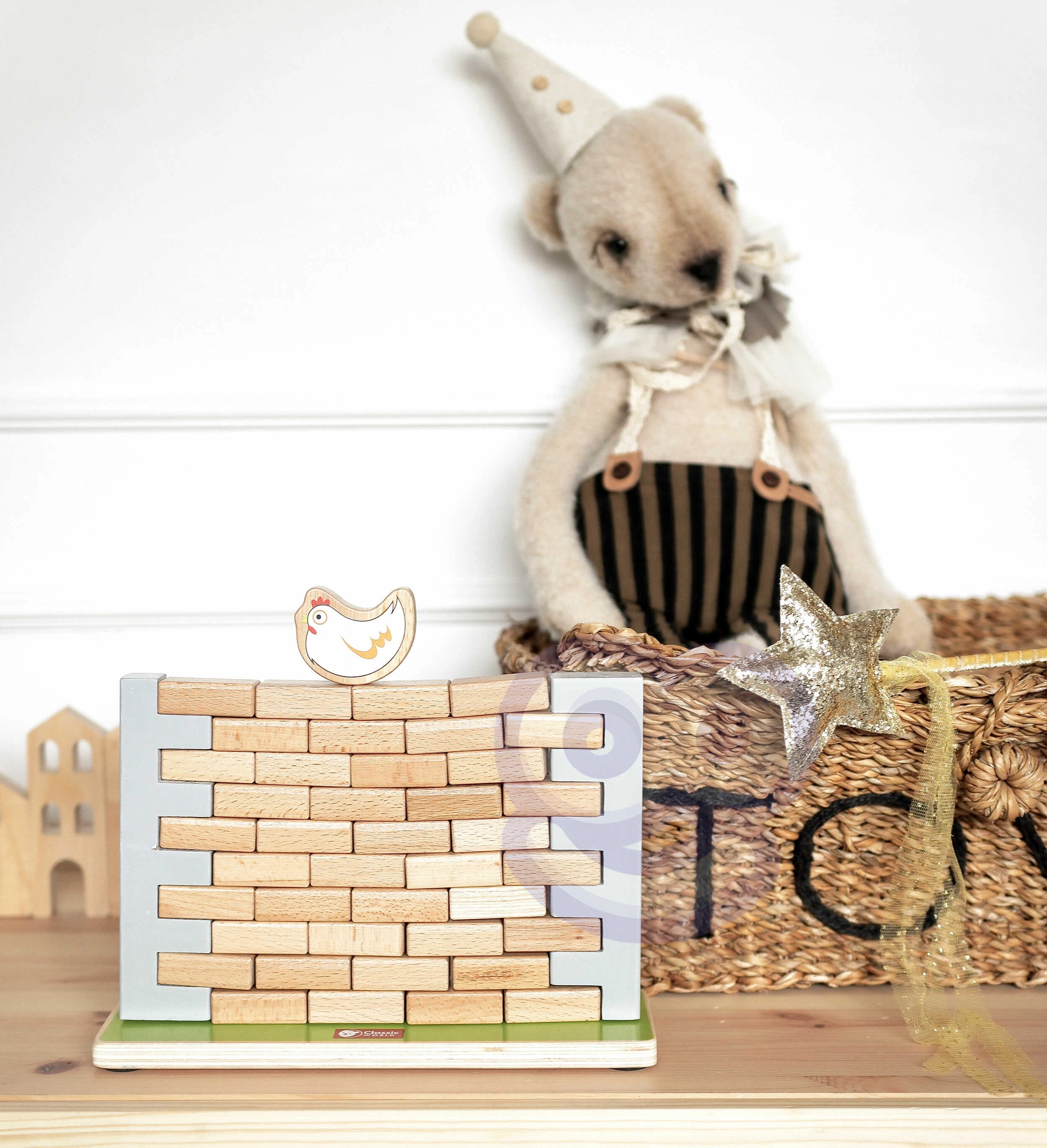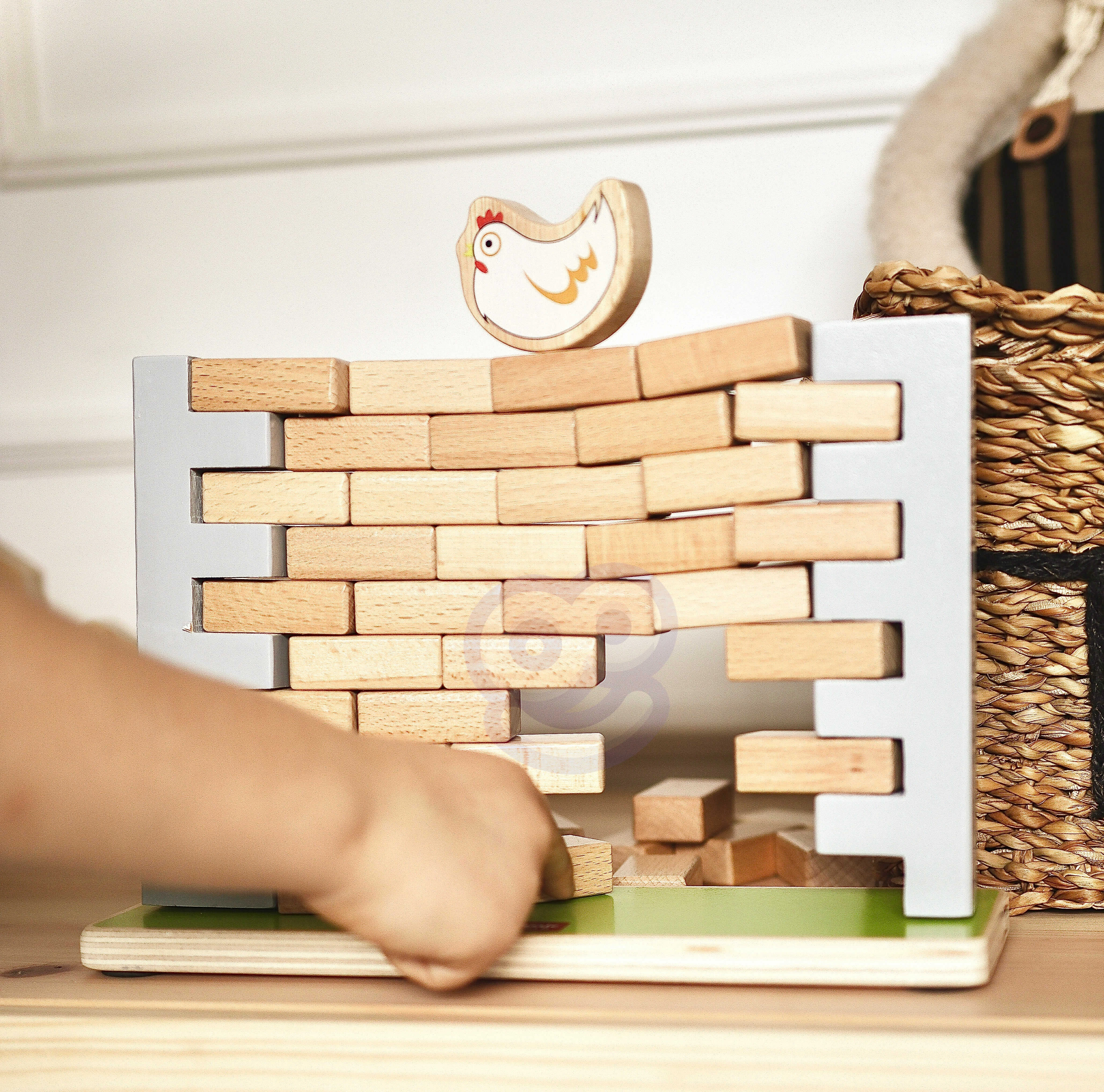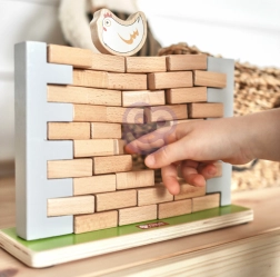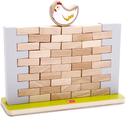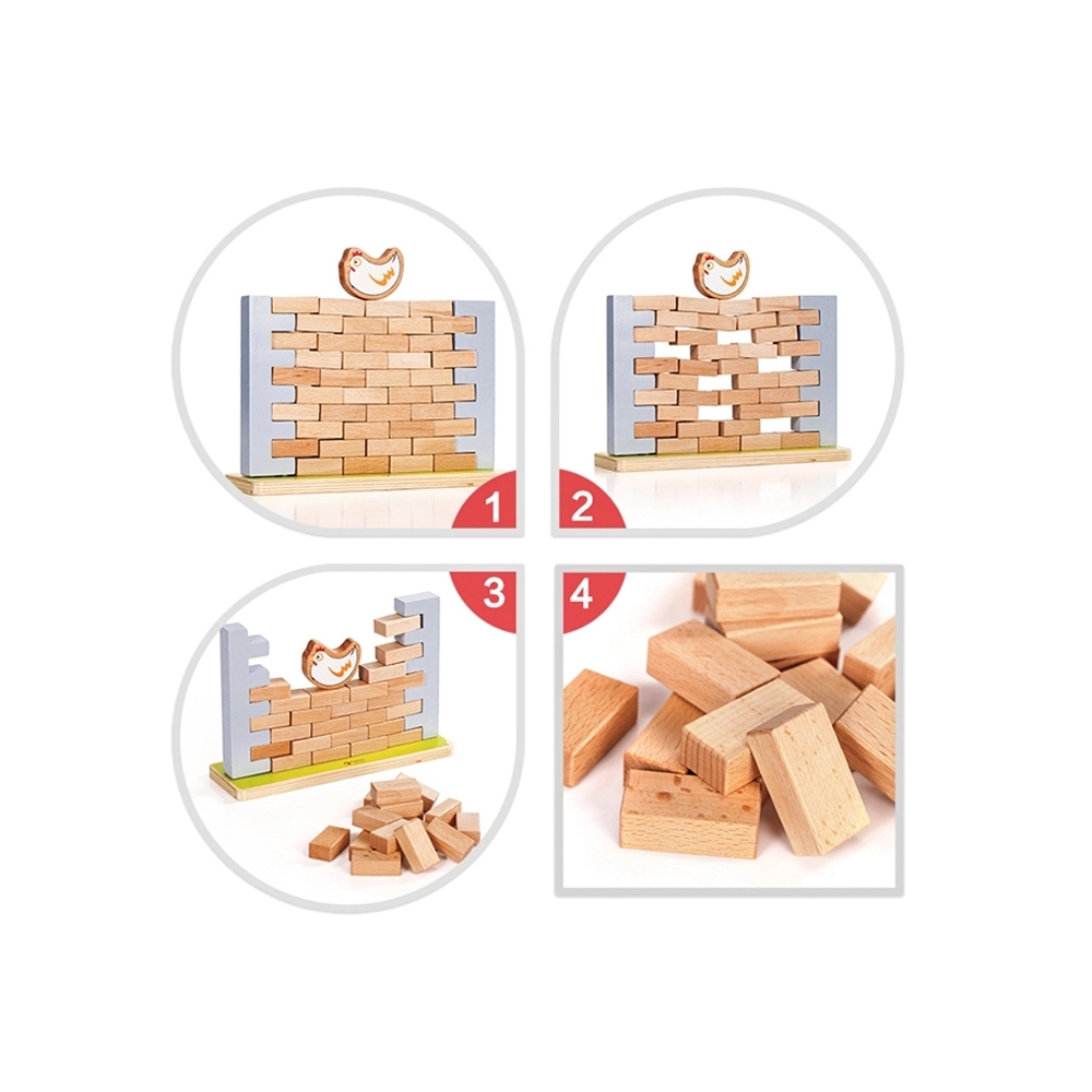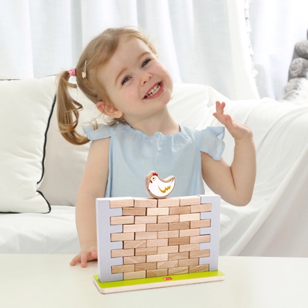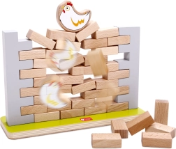 Тази висококачествена дървена балансираща игра предлага лесни правила и много напрежение. Целта е да се изваждат тухлички от стената така, че да не падне кокошката на върха ѝ. Децата ще упражнят търпение, концентрация и решаване на проблеми, докато се забавляват с родители или с братя и сестри.