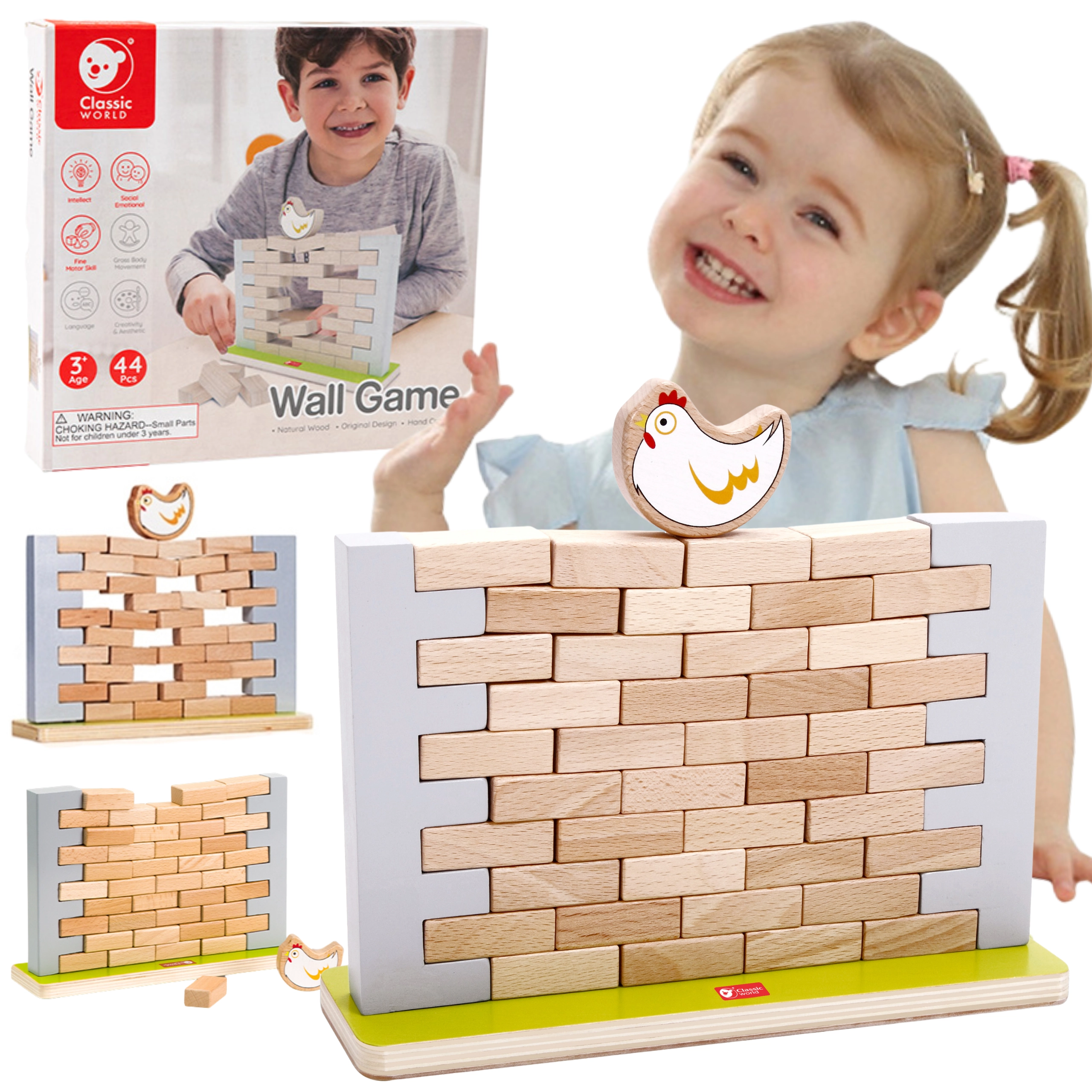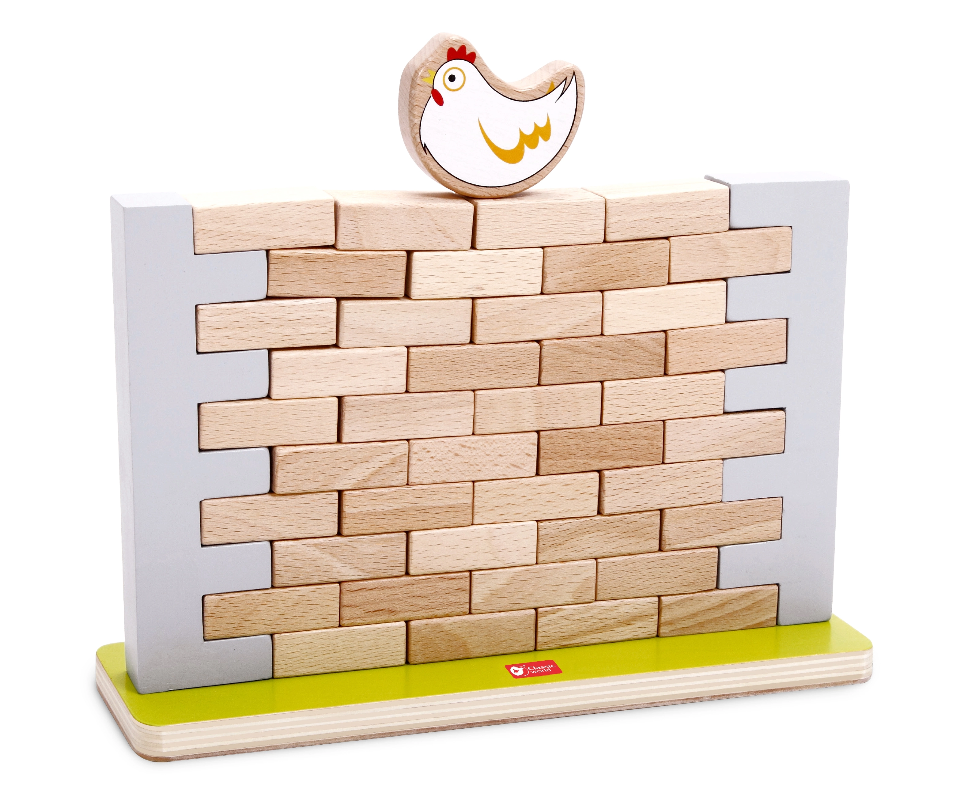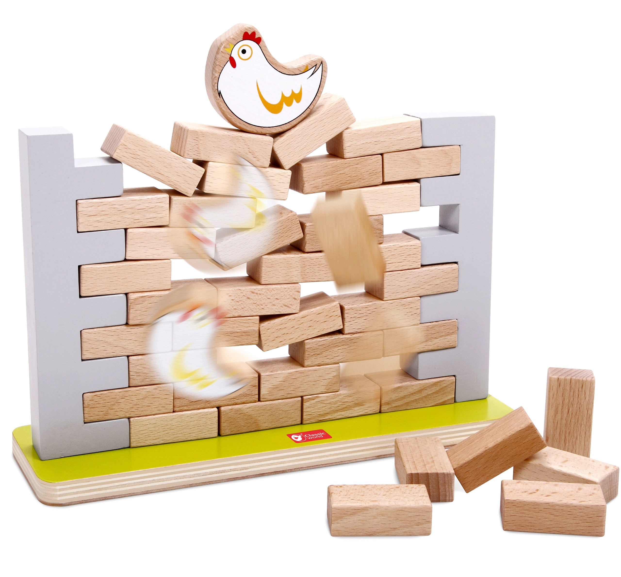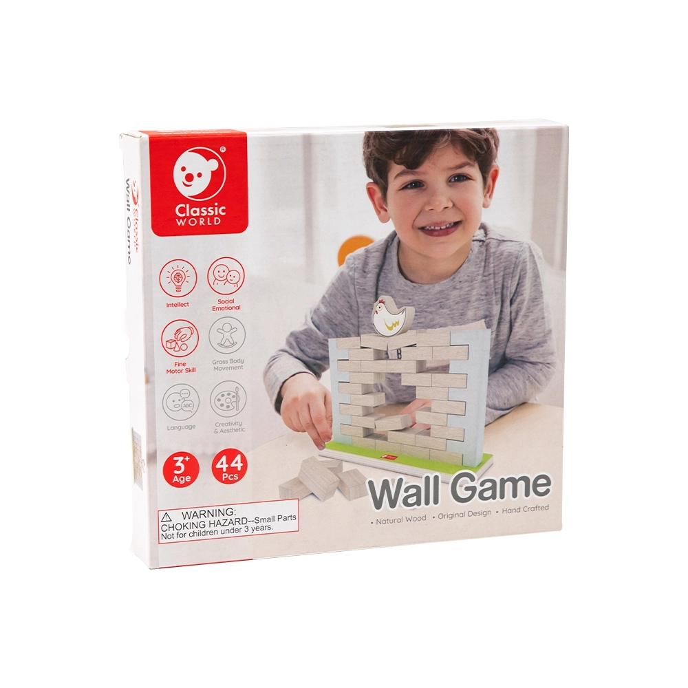 Забавна и образователна детска балансираща игра от марката CLASSIC WORLD. Постройте от дървени „тухлички“ стабилна стена, поставете на върха кокошка и после постепенно изтегляйте тухлички така, че конструкцията да не се срути. Играта развива фината моторика, координацията око–ръка, логическото мислене и стратегията и е чудесна за деца от 3 години и за цялото семейство.
