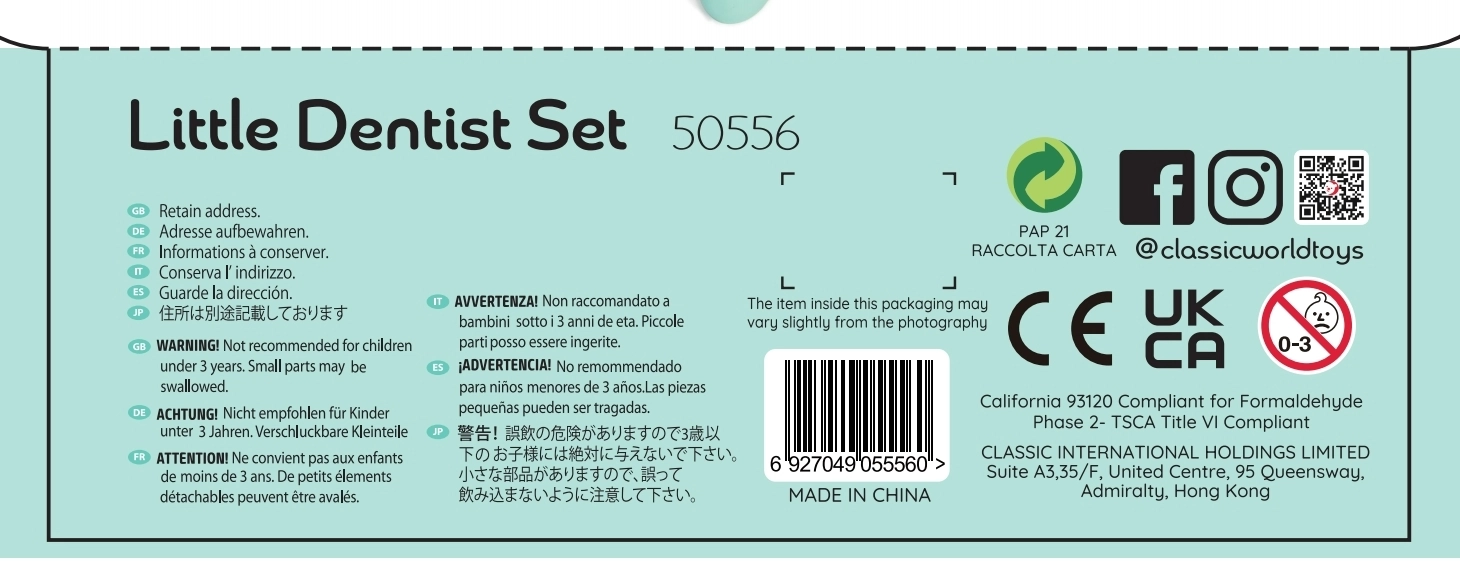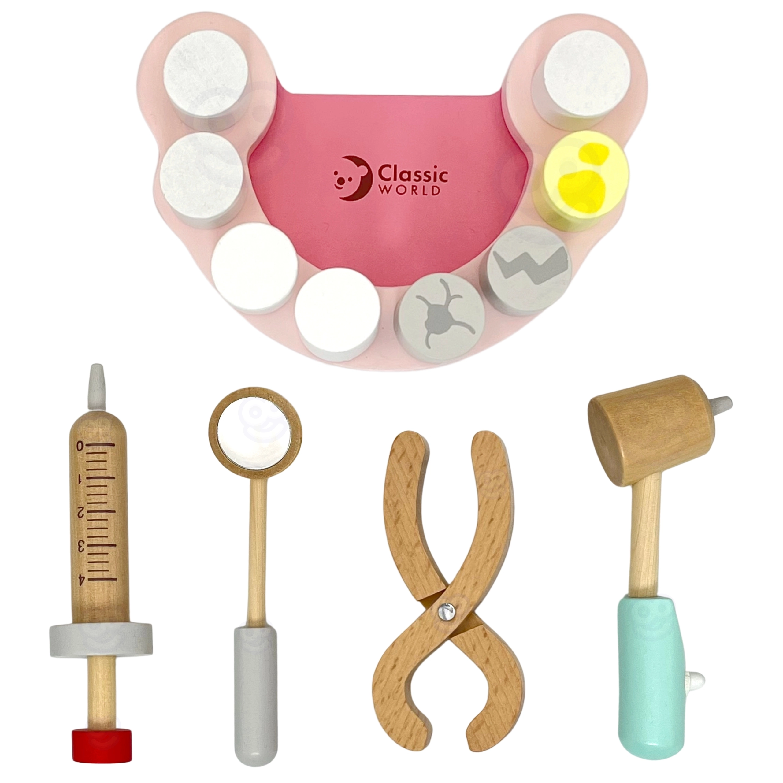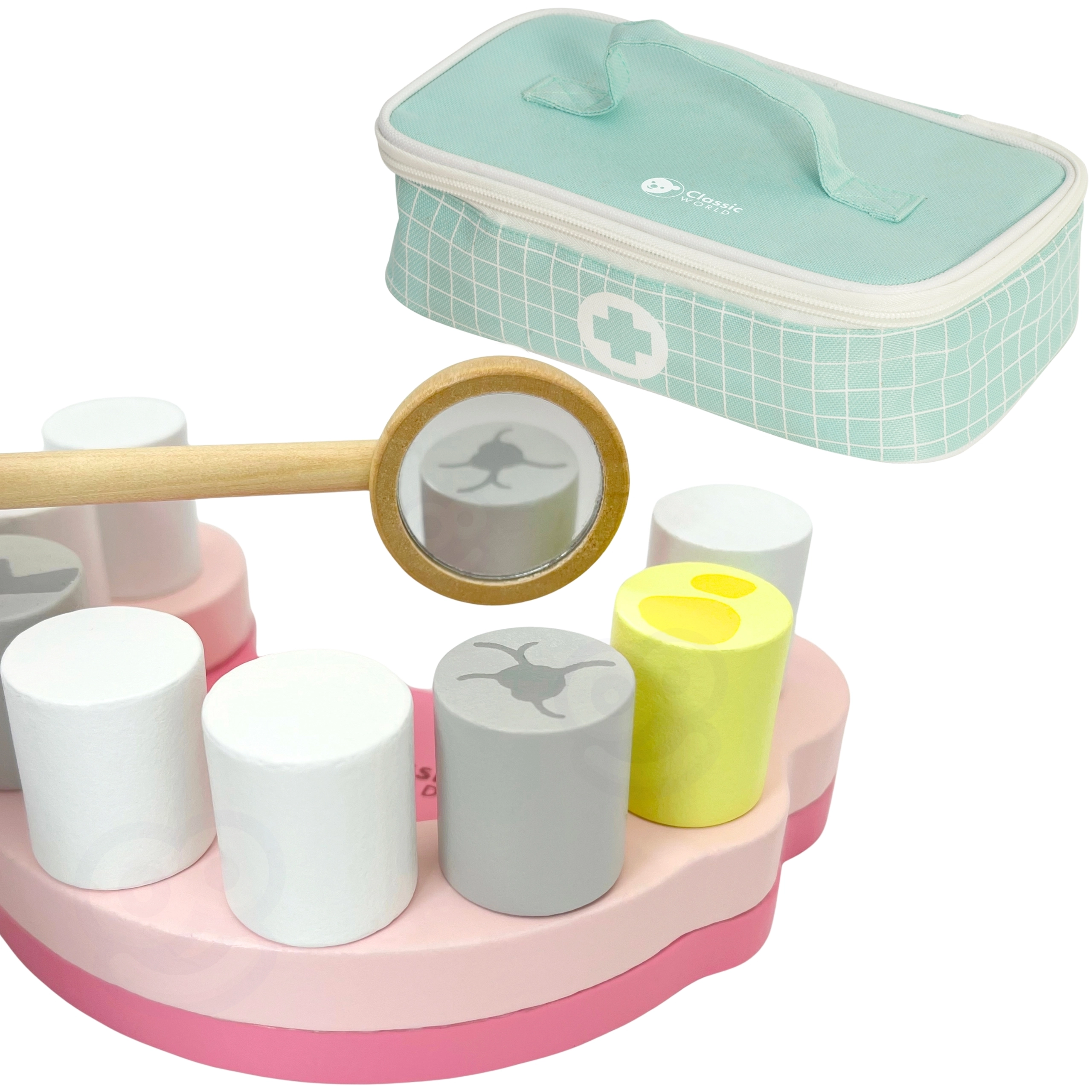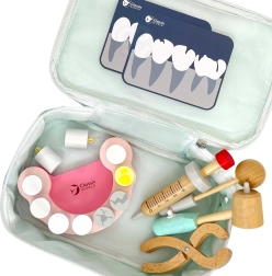 Открийте забавна и поучителна игра на зъболекар с комплекта Classic World. Този дървен сет в практично куфарче съдържа всичко, от което малкият лекар се нуждае за грижа за зъбите – от модел на челюст до инструменти. Подпомага ролева игра, развива емпатия, фината моторика и учи на правилни навици за дентална хигиена.