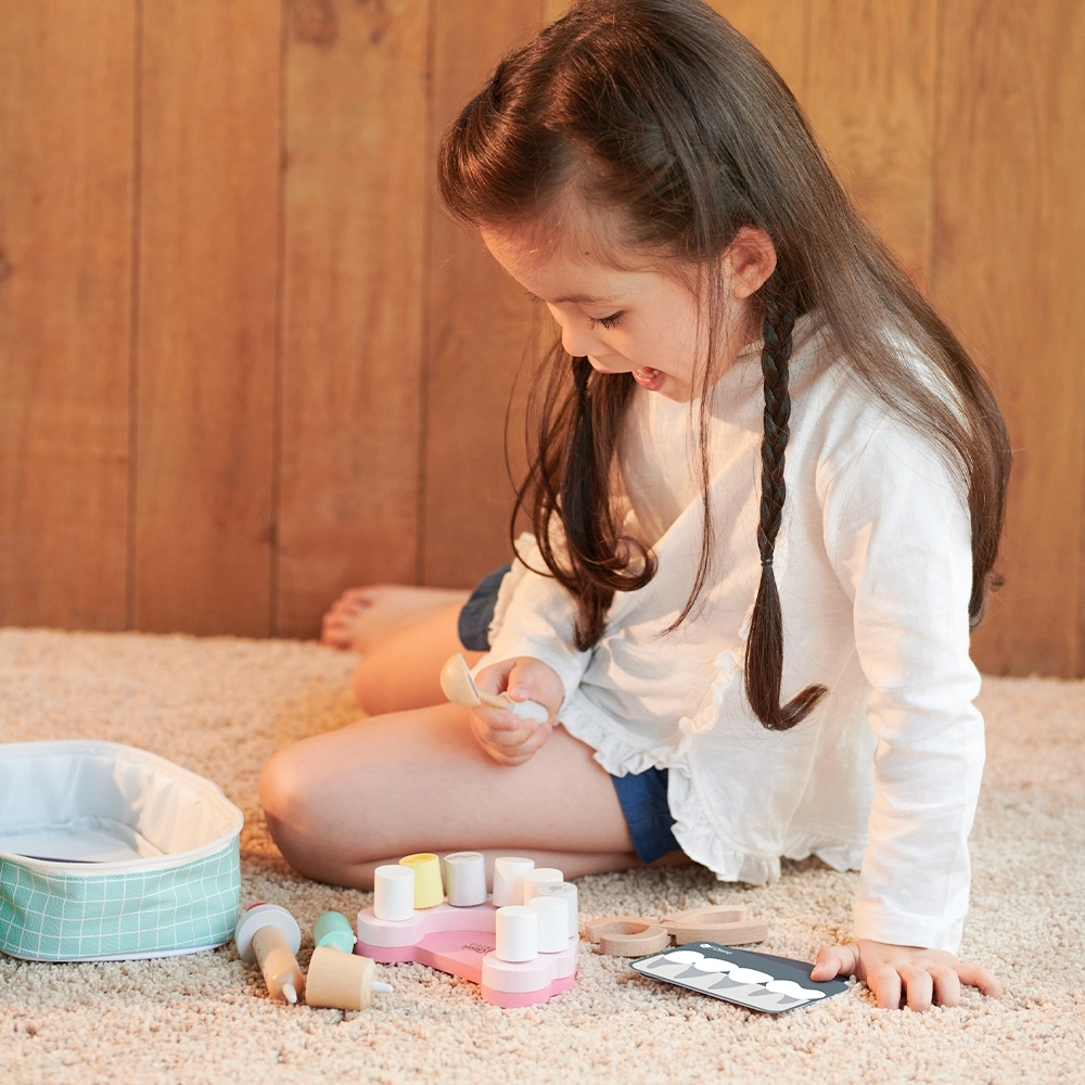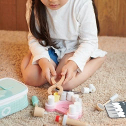 Премиум изработка от естествено дърво гарантира издръжливост и дълъг живот. Практичното куфарче държи всички части заедно, което прави комплекта идеален и за път. Благодарение на атрактивния дизайн в нежни цветове е чудесен подарък за деца от 3 години.