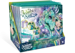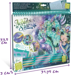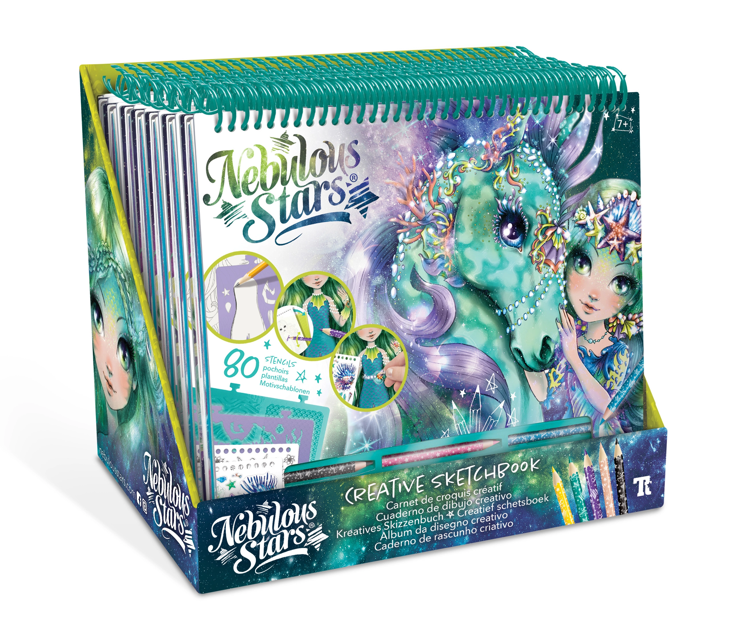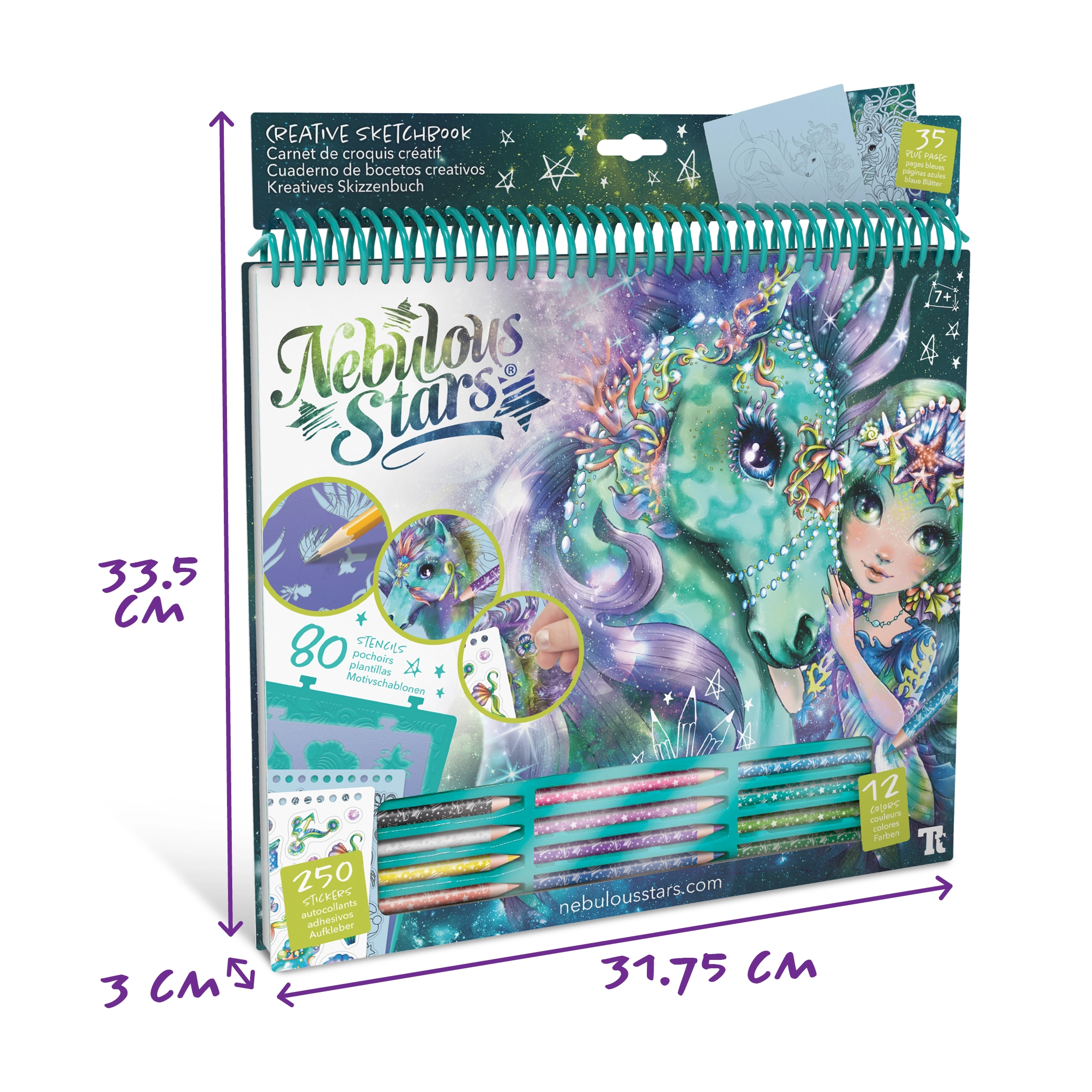 Открийте вълшебния свят на NEBULOUS STARS с креативен скицник в зелено. Комплектът предлага всичко за творчество – от 250 стикера през 12 цветни молива до 80 шаблона и 35 листа с картинки. Благодарение на инструкции за 12 рисувателни техники децата развиват фантазията, фината моторика и усета към цветовете. Идеален подарък за малки художници от 7 години.