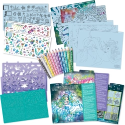 250 стикера, 12 цветни молива, 80 шаблона, 35 листа с картинки, 4 пластмасови форми, инструкции за 12 рисувателни техники
