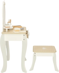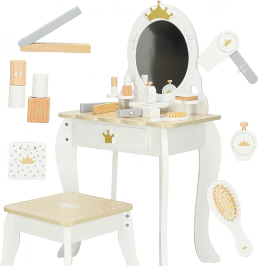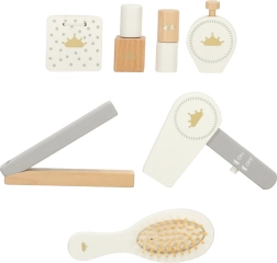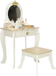 В комплекта ще намерите богат набор от дървени аксесоари: четка за коса, сешоар, преса за коса, палитра сенки, „парфюм“, лак за нокти и червило – всичко това са безопасни имитации за ролева игра без безпорядък. Тоалетката подпомага креативността, фината моторика и самообслужващите умения.