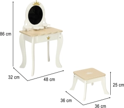 Тоалетката и аксесоарите са изработени от гладко шлайфано дърво и лакирани с нетоксични бои – идеални за ежедневна игра без притеснения.