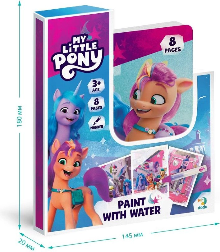 Водното рисуване My Little Pony е креативен комплект за деца, който развива въображението без необходимост от класически бои. Достатъчно е да напълните включената писалка с вода и да наблюдавате как картинките с любимите понита се оцветяват мигновено. След изсъхване цветовете избледняват и детето може да рисува отново.