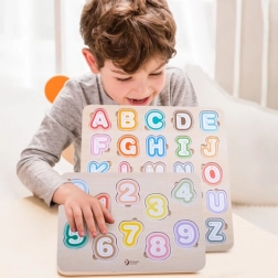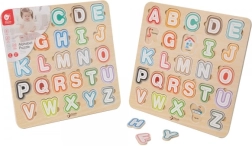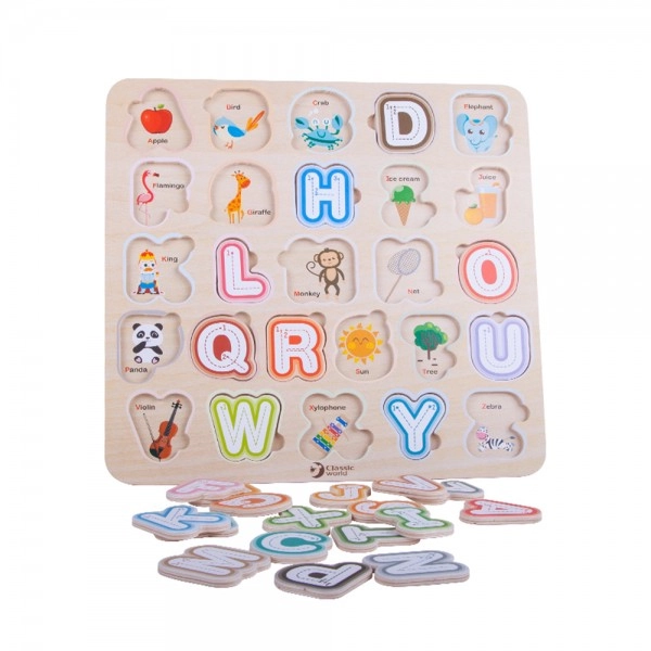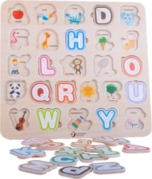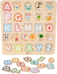 Забавна и едновременно образователна игра за най-малките: цветна дървена вложка с азбука развива фината моторика, логиката и разпознаването на буквите. Под всяка буква има изображение на английски, така че децата естествено усвояват основите на английския още от ранна възраст.