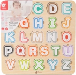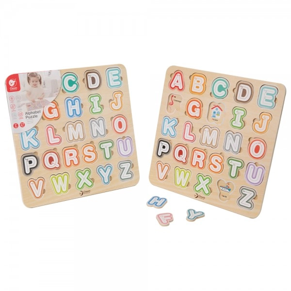 Тази качествена дървена азбука с размер 30 × 30 см подпомага първите стъпки към четене и писане. Цветните подвижни елементи се поставят в съответните форми, с което децата тренират координацията око–ръка и пространственото въображение. Благодарение на картинките под буквите малчуганите по игрови начин се запознават и с английски думички.