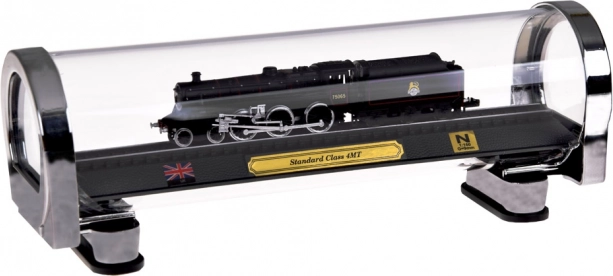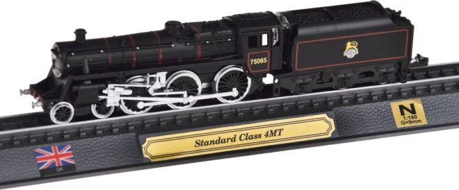 Този детайлен модел на британския парен локомотив STANDARD CLASS 4MT е идеален избор за любители на железницата и стилните декорации. Прецизната изработка в мащаб 1:160 акцентира върху автентични детайли, контрастно боядисване и фина лайсна на колелата. Моделът е закрепен върху участък релси на елегантна основа с табелка, британски флаг и означен мащаб.