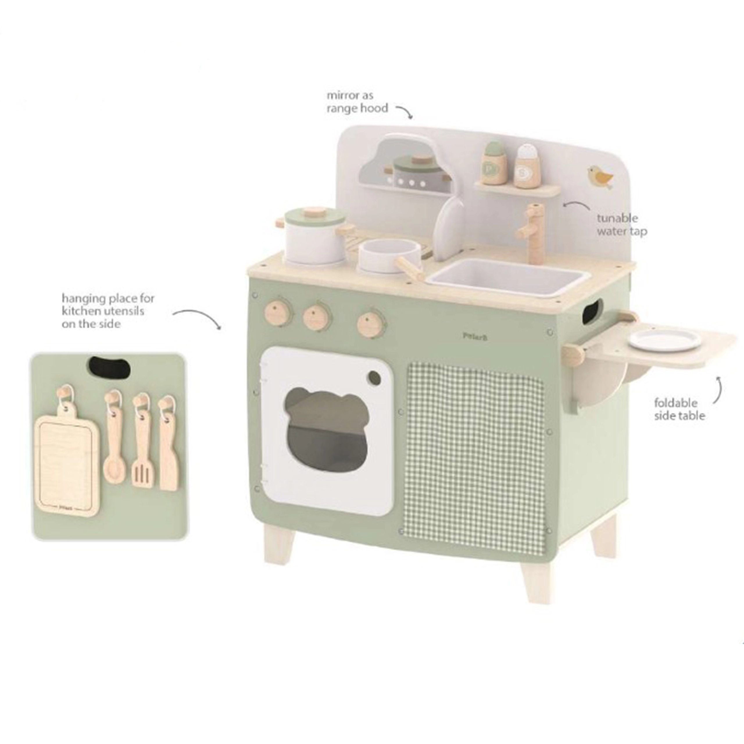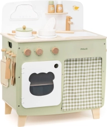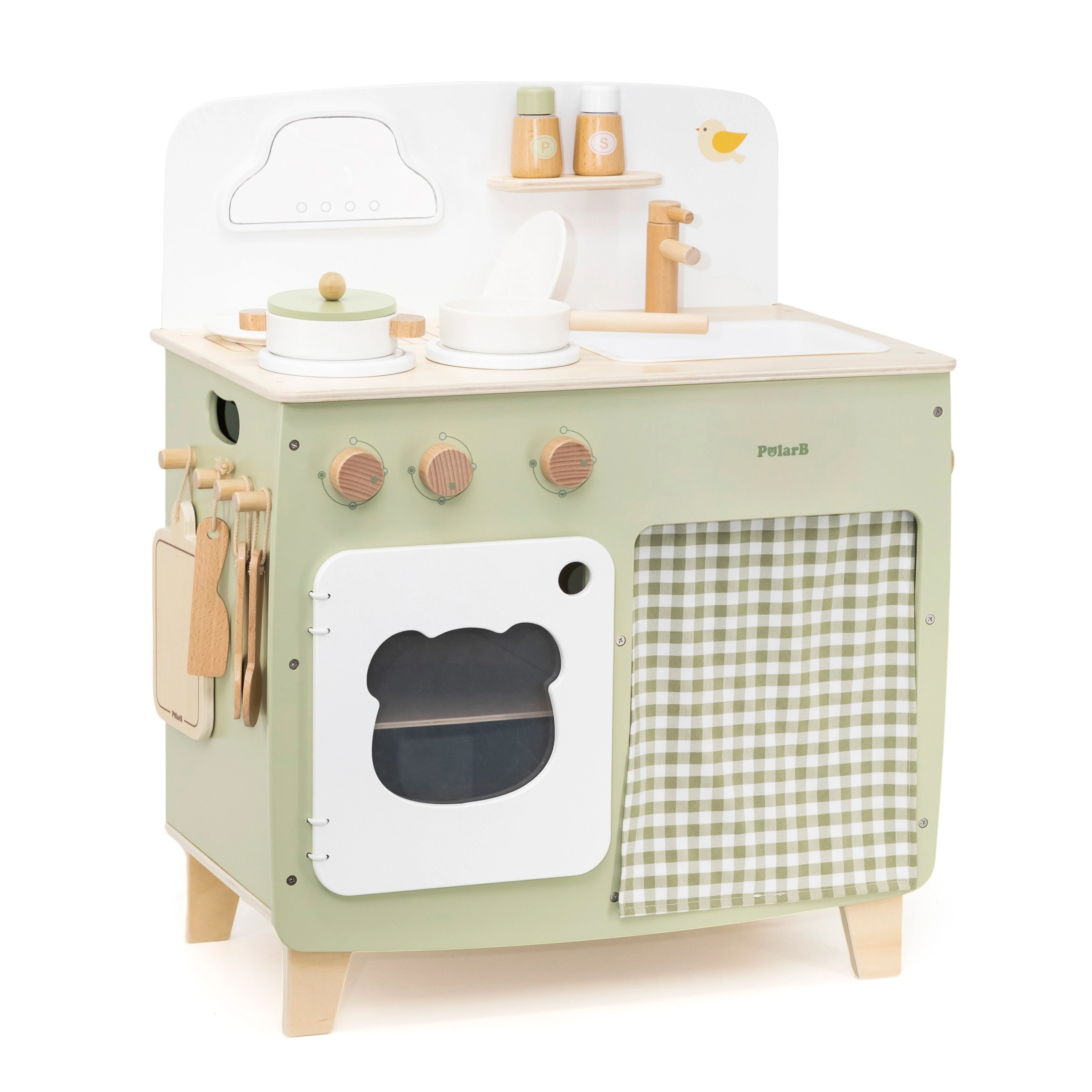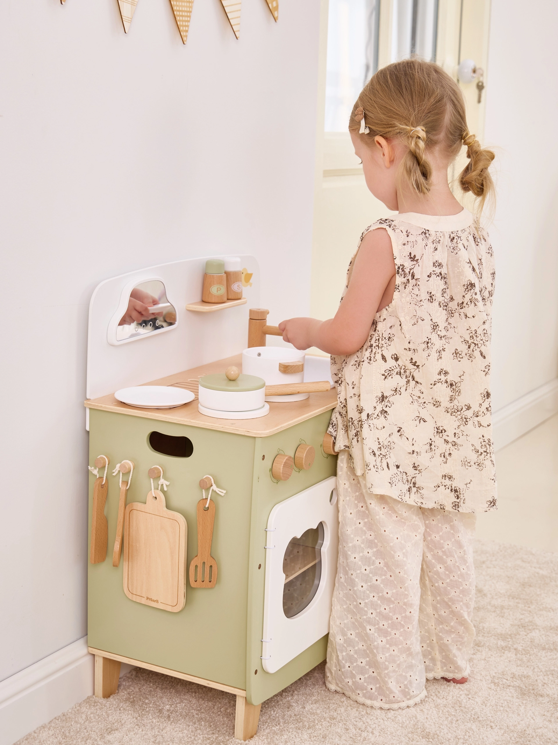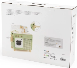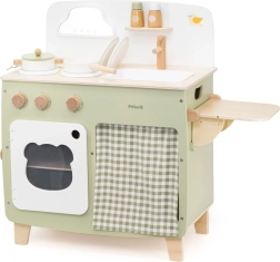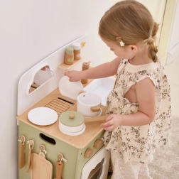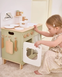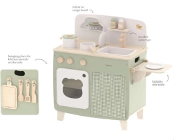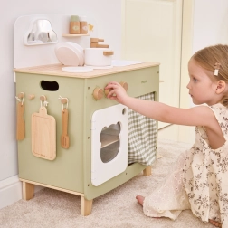 Стилна детска кухня в приятни естествени и зелени тонове предлага на децата реалистично кулинарно изживяване. Благодарение на здравата дървена конструкция, въртящите се копчета, мивката и фурната малките готвачи ще се радват на часове безопасна и творческа игра. Практичният сгъваем страничен плот разширява работната повърхност за рязане или хранене, докато шкафът с перденце скрива всички съкровища.