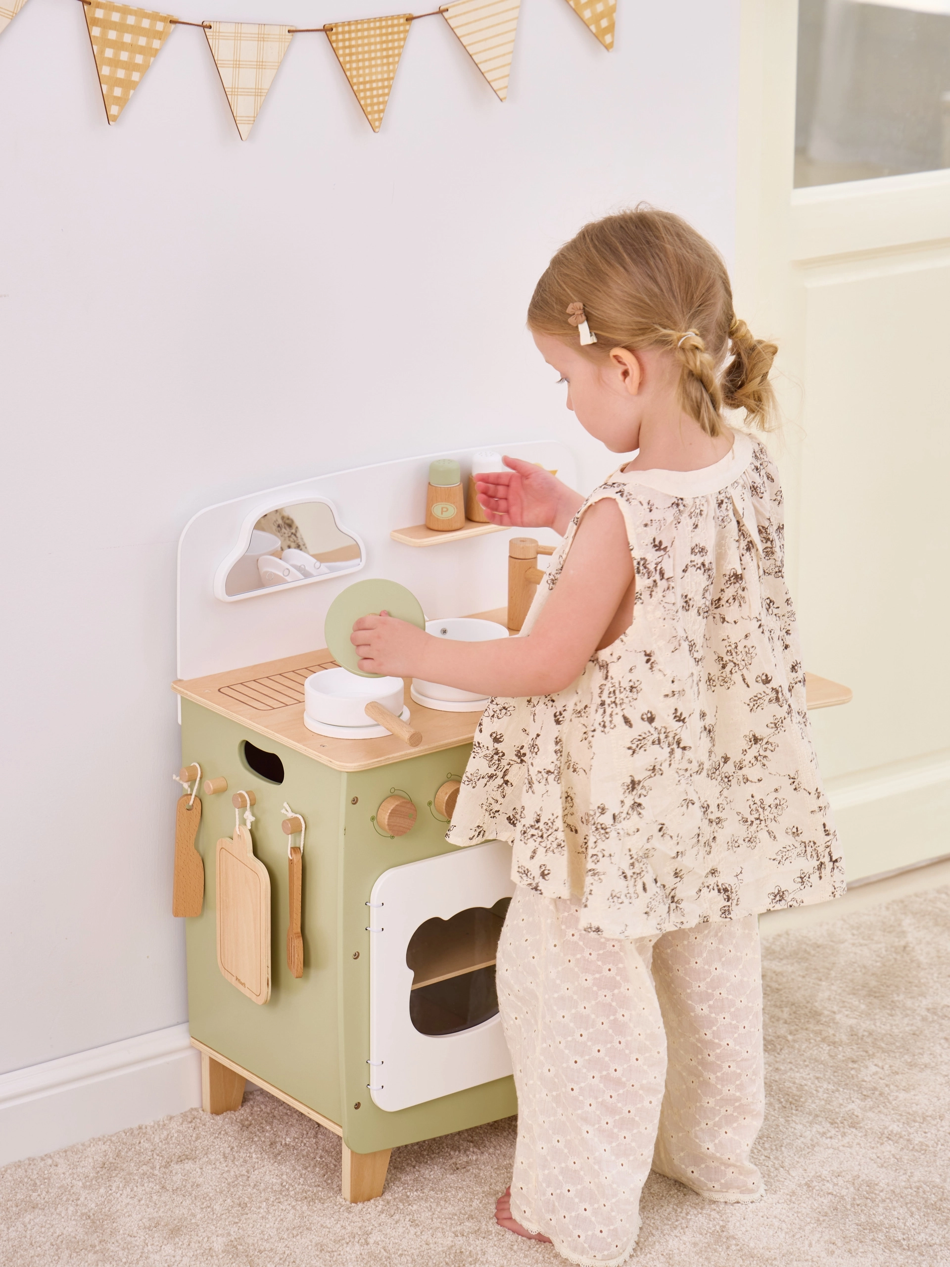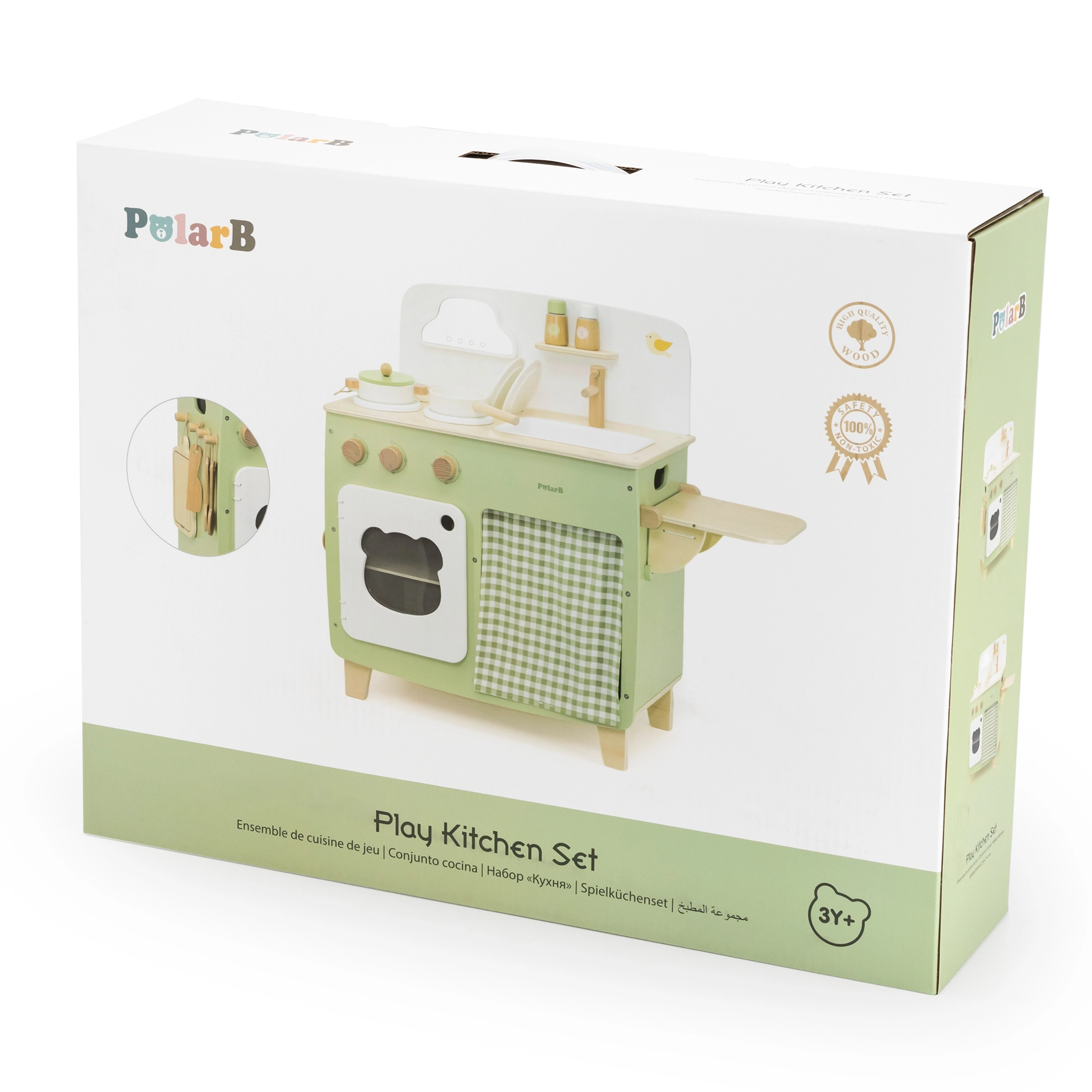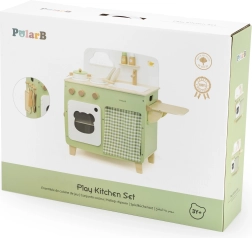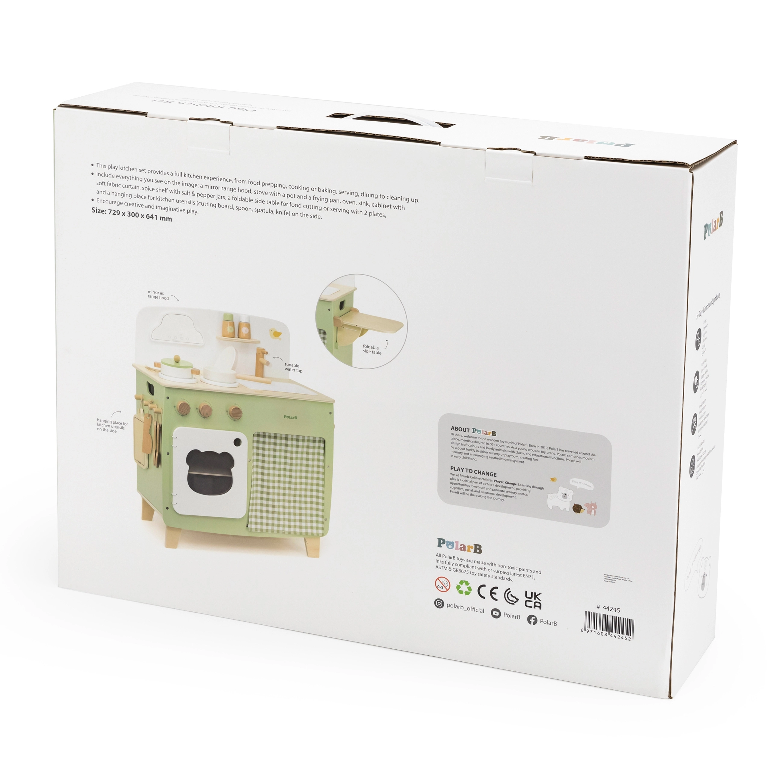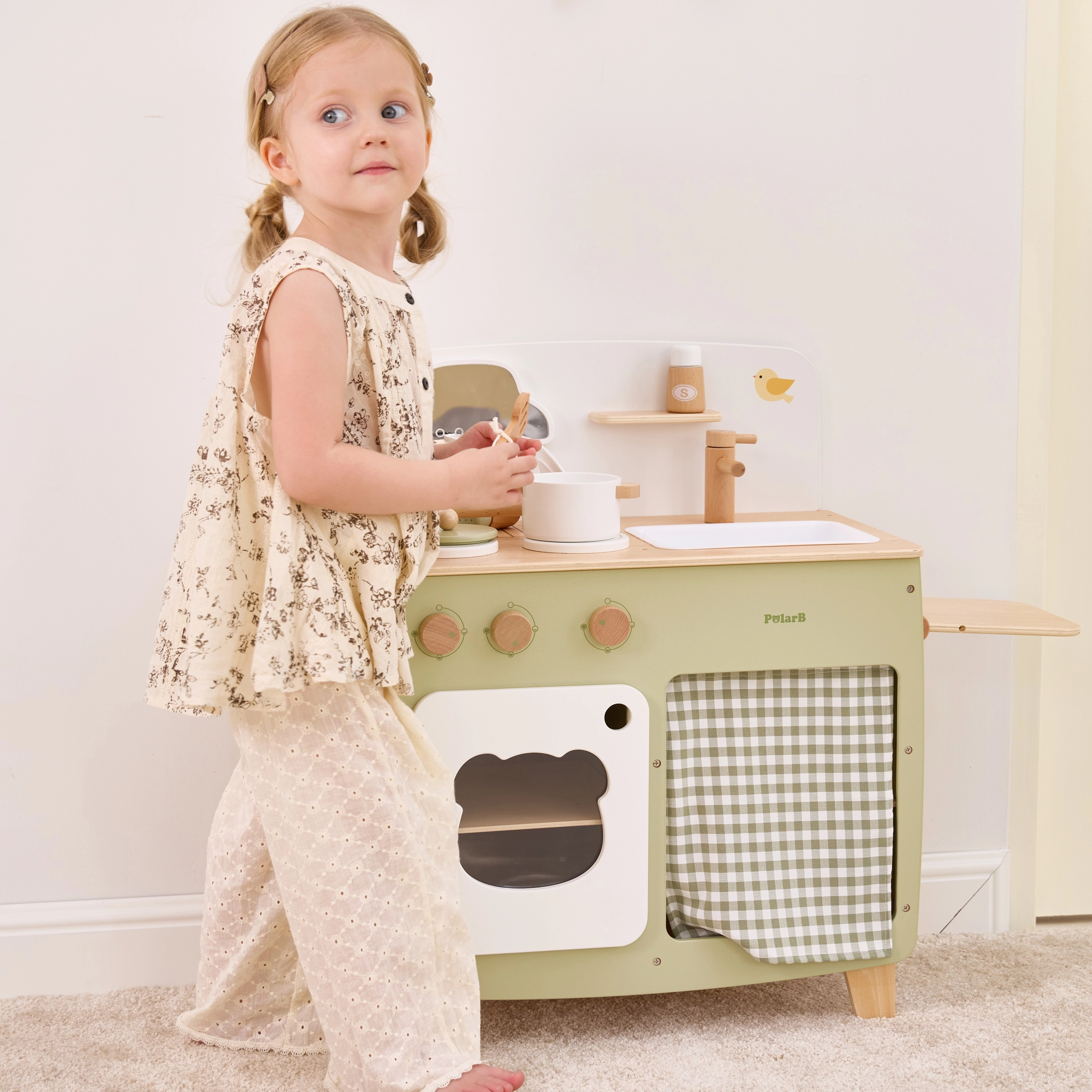 Стилна детска кухня в приятни естествени и зелени тонове предлага на децата реалистично кулинарно изживяване. Благодарение на здравата дървена конструкция, въртящите се копчета, мивката и фурната малките готвачи ще се радват на часове безопасна и творческа игра. Практичният сгъваем страничен плот разширява работната повърхност за рязане или хранене, докато шкафът с перденце скрива всички съкровища.