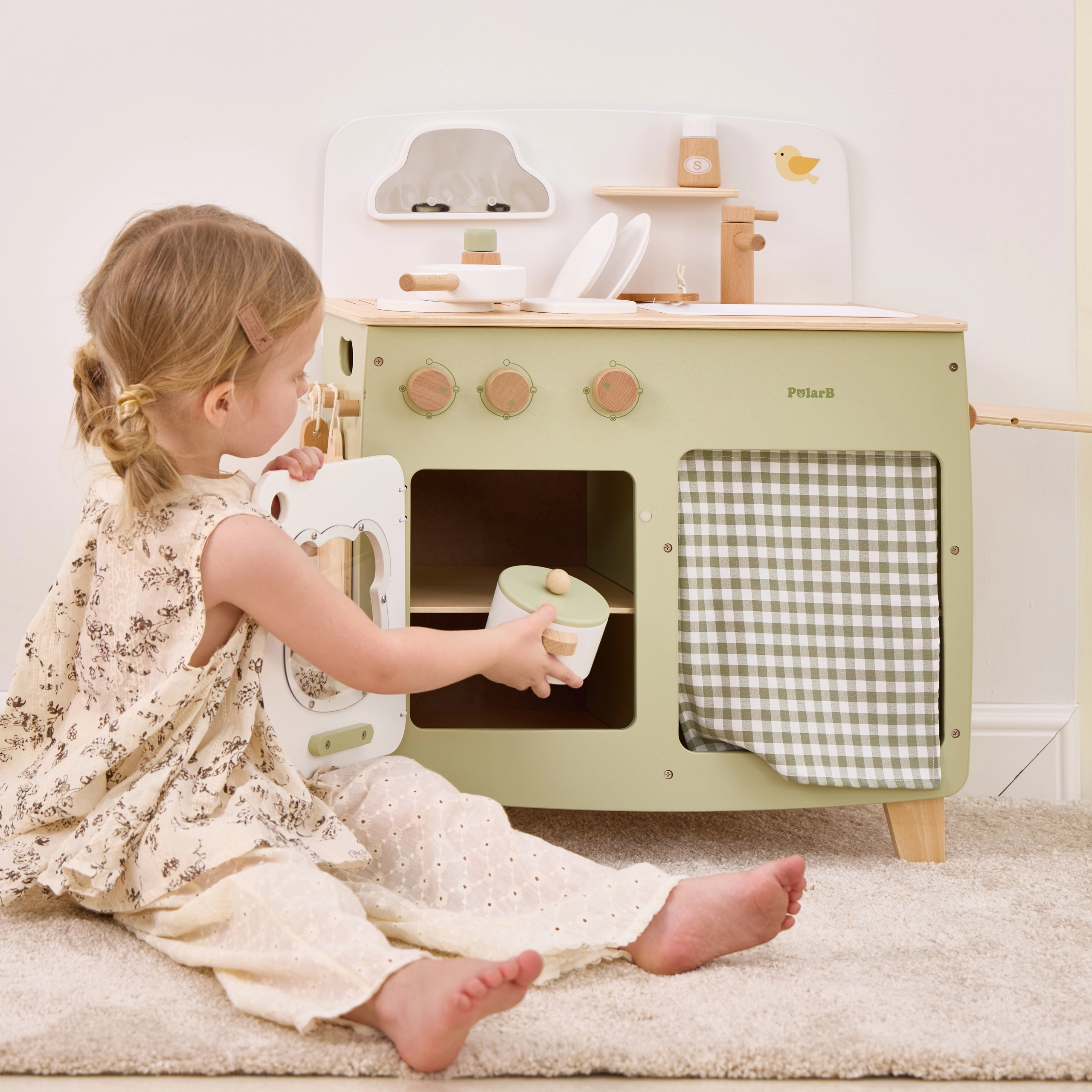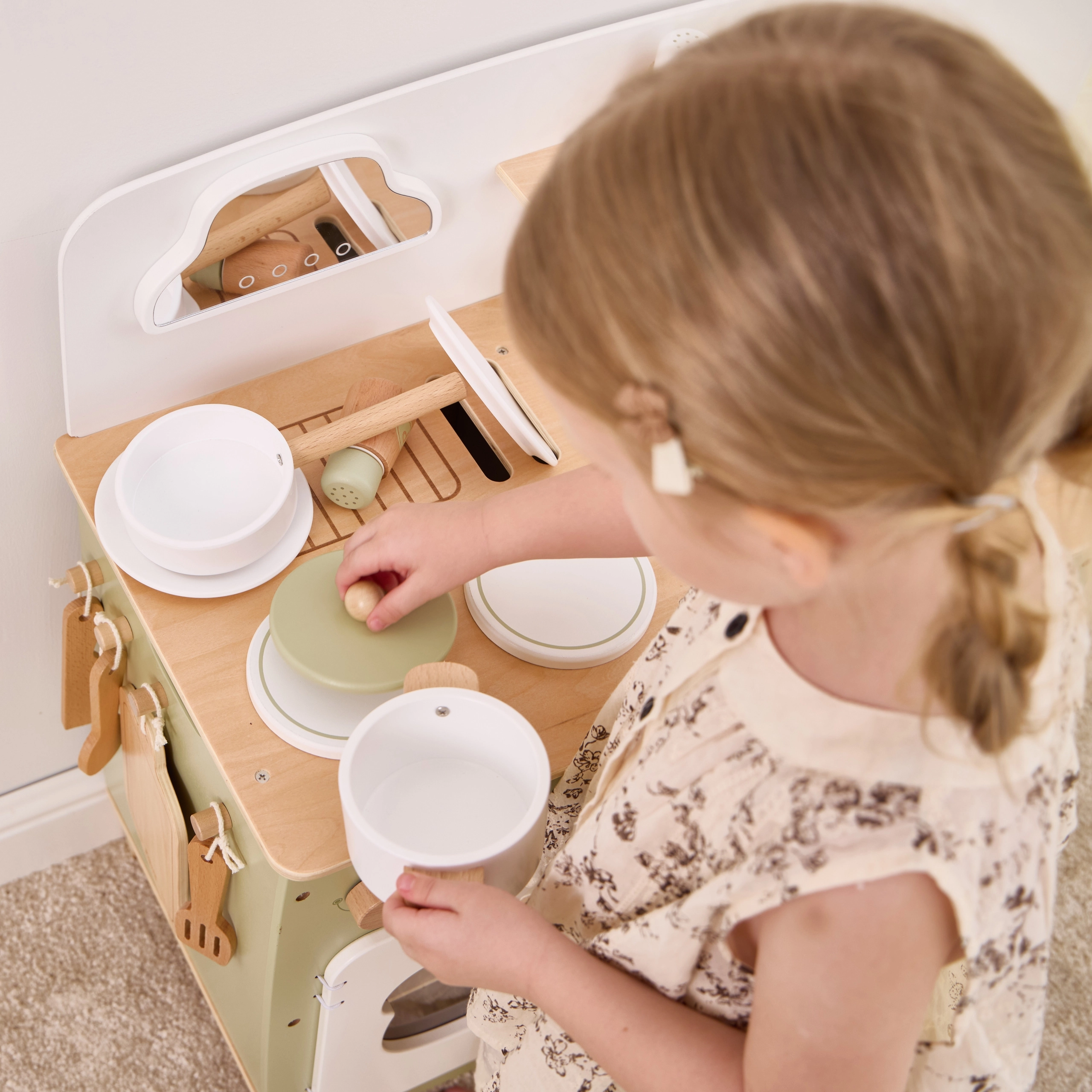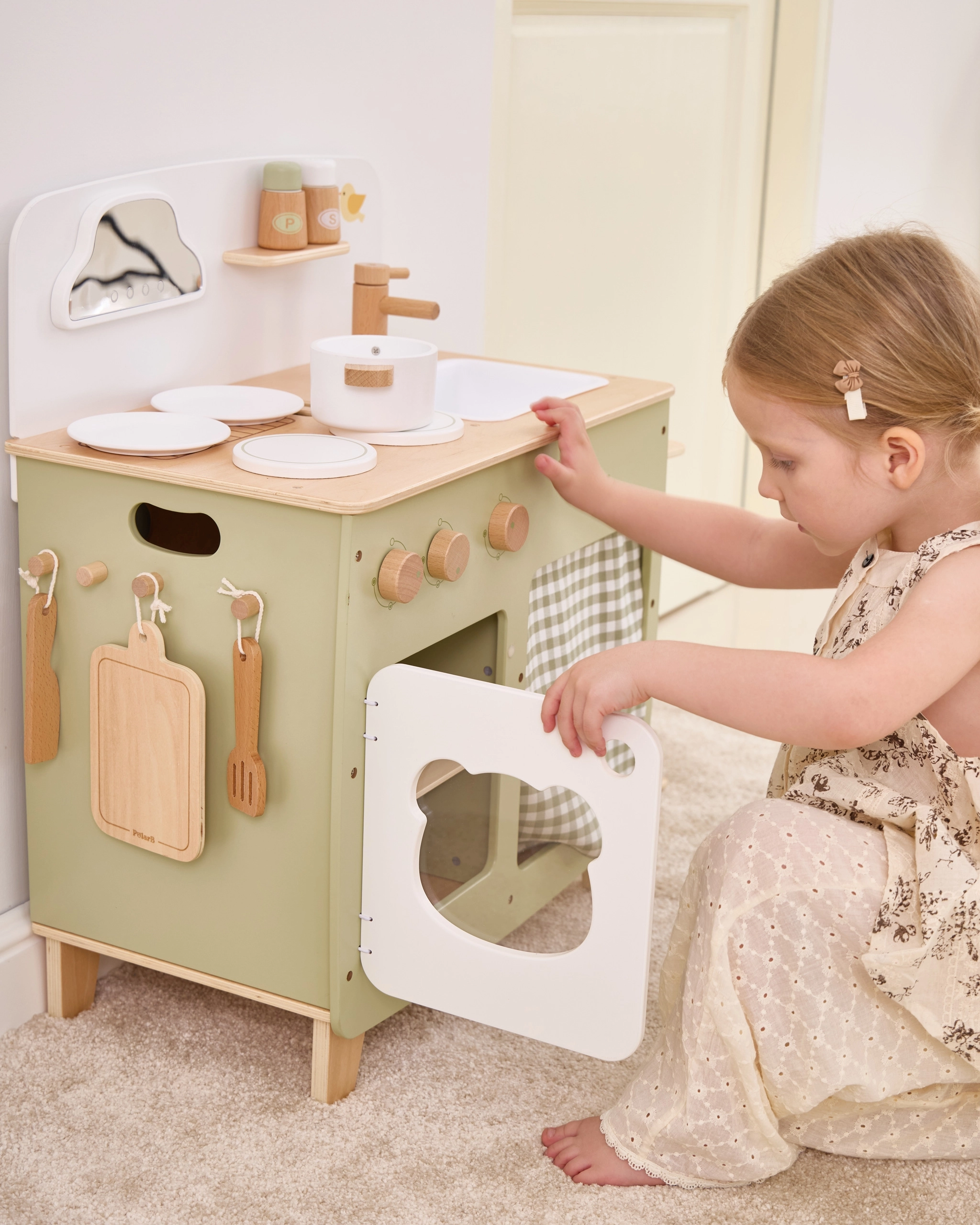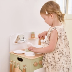 Въртящи се копчета на котлоните и фурната, мивка с батерия, кукички за прибори и бурканчета за подправки насърчават имитативната игра и фината моторика.