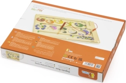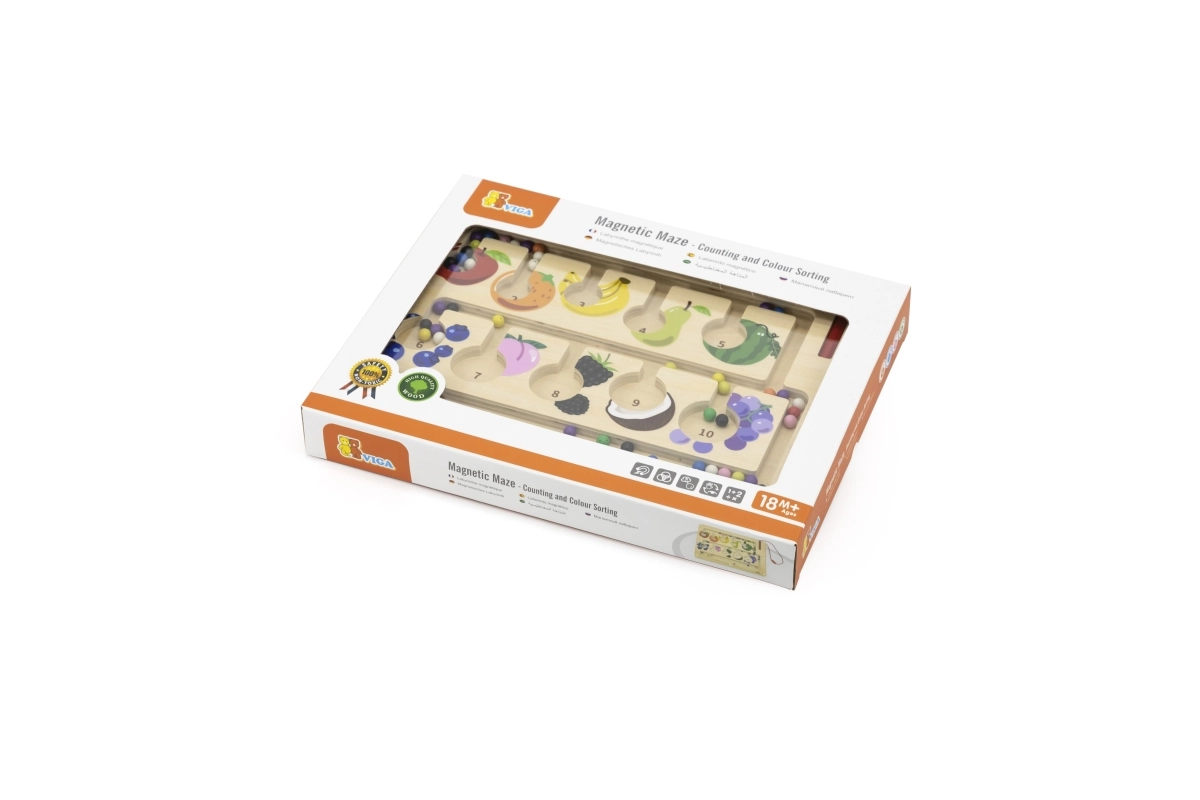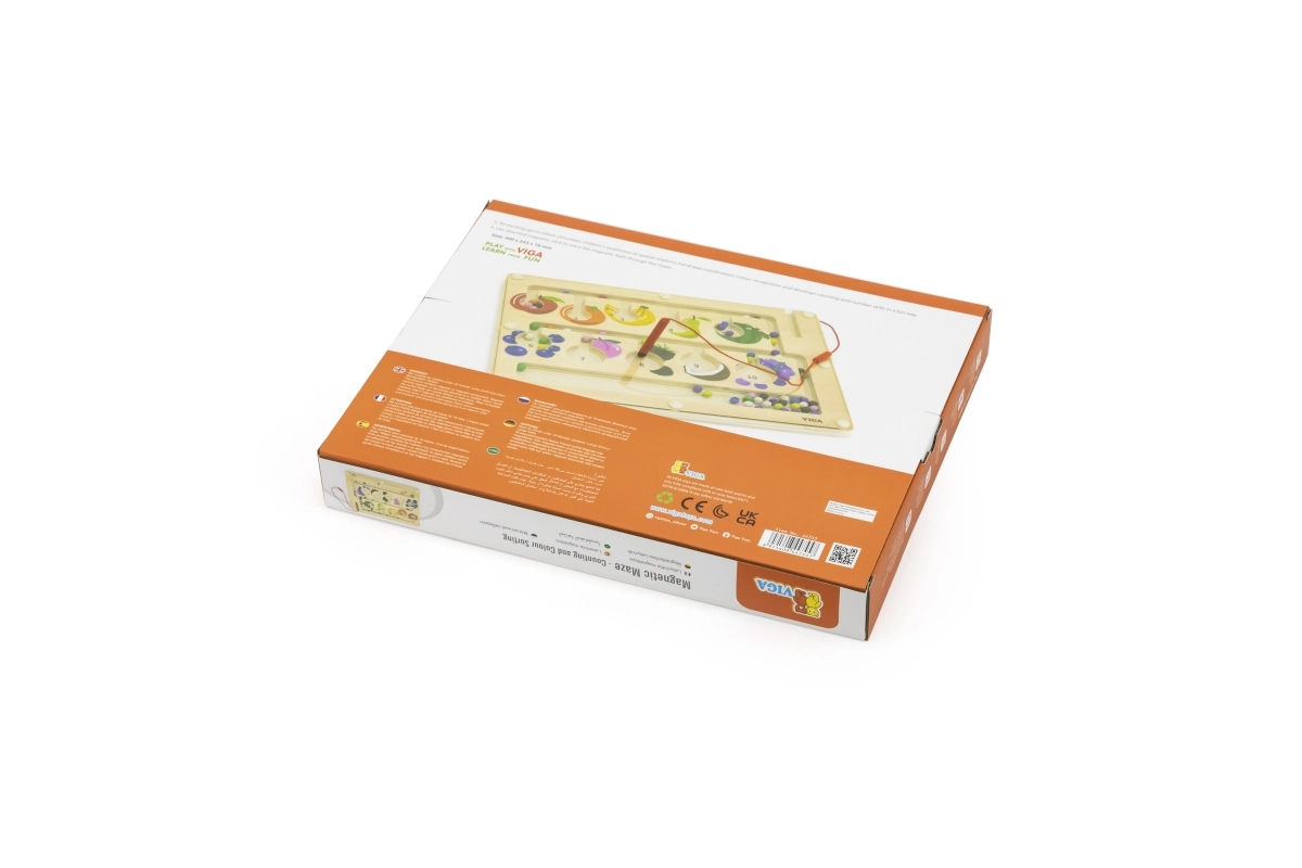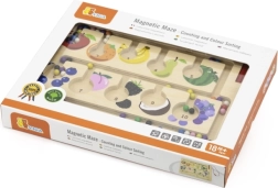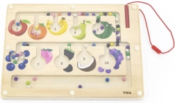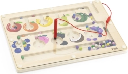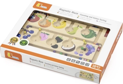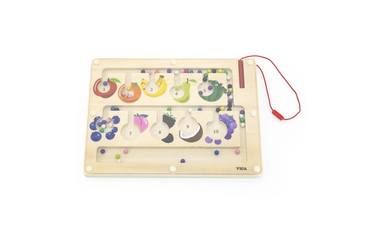 Този качествен дървен магнитен лабиринт е чудесна образователна играчка за развитие на детската сръчност. Децата с помощта на магнитна писалка преместват цветните топчета по обозначените пътечки, сортират ги по цветове и ги съотнасят към изображения на плодове или числа. Играта развива логическото мислене, концентрацията и координацията око–ръка.