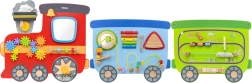 Всеки вагон предлага различна активност: червен локомотив с зъбни колела, водно колелце и огледалце, син вагон с ксилофон и лабиринт с мъниста и зелен вагон с плъзгаща се влакова писта и въртящи се кубчета с мотиви на световни места. Благодарение на разнообразието от елементи децата не скучаят и естествено развиват умения в духа на Монтесори.