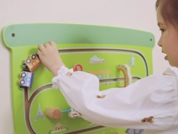 Интерактивното стеннo влакче превръща всяка стая в игриво образователно кътче. Трите самостоятелни панела се монтират лесно на стена и пестят място, а пъстрите цветове и тактилните елементи канят към откривателство. Децата тренират захвата, координацията око–ръка и разбирането на причини и следствия, всичко това безопасно благодарение на прецизната дървена изработка и нетоксичните бои.