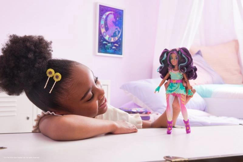 Куклата носи розово- тюркоазена рокля с венчелистчета, клин с мотиви Магия на растенията, цветни обувки и аксесоари като фибички, ръкавици и колан с пеперуди. С аксесоарите за прическа ще създадете много стилове и истории. Разширете колекцията си с още герои и техните еднорози за още по-големи приключения на Острова на еднорозите.