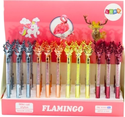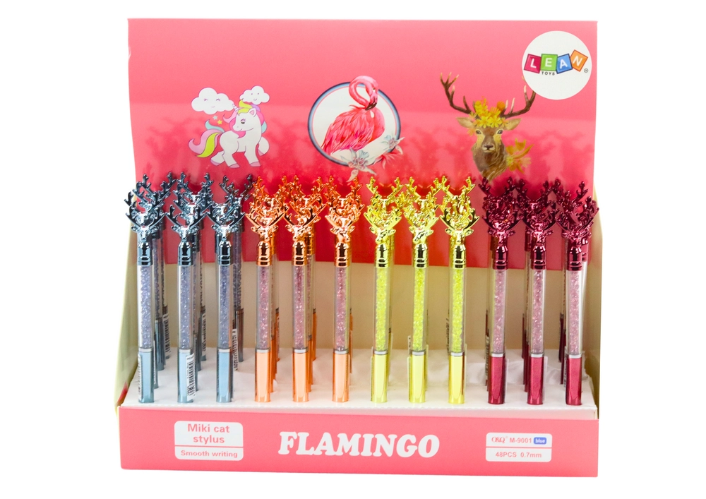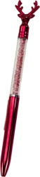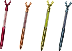 Елегантна химикалка с нежна фигурка на елен и прозрачно тяло, запълнено с блестящи камъчета, придава луксозен акцент на писането. Предлага синьо или черно мастило, фин връх 0,7 мм и удобно писане за ежедневна употреба и специални поводи.